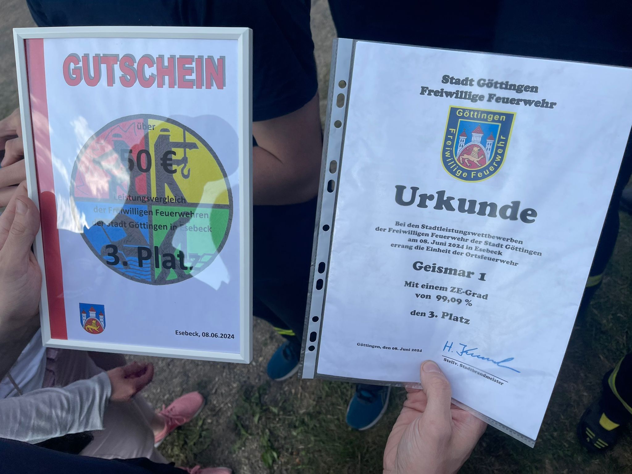 Aus Anlass des 90-jährigem Jubiläum der OF Esebeck fand der Stadtfeuerwehrtag 2024 am 08. Juni dort statt. Der Ort war an diesem Samstag voll von Feuerwehrangehörigen aus allen Ortsteilen der Stadt Göttingen. Am Wettbewerb der Kinderfeuerwehren nahmen 25 Gruppen teil. Hier hieß der Sieger Holtensen 2, vor Roringen 1 und Elliehausen. Die beiden Geismaraner Gruppen belegten den 18 bzw. den 22 Platz. Zehn Gruppen waren bei den Jugendwettbewerben dabei. Hier siegte Herberhausen, vor Elliehausen und Grone. Die Jugendfeuerwehr Geismar belegte einen super tollen 5. Platz. Am Nachmittag waren dann die Aktiven dran. Hier gingen insgesamt 16 Gruppen an den Start und dabei holte die Gruppe Geismar 1 einen bombastischen 3. Platz. Die Gruppe Geismar 2 belegte den 12. Platz.