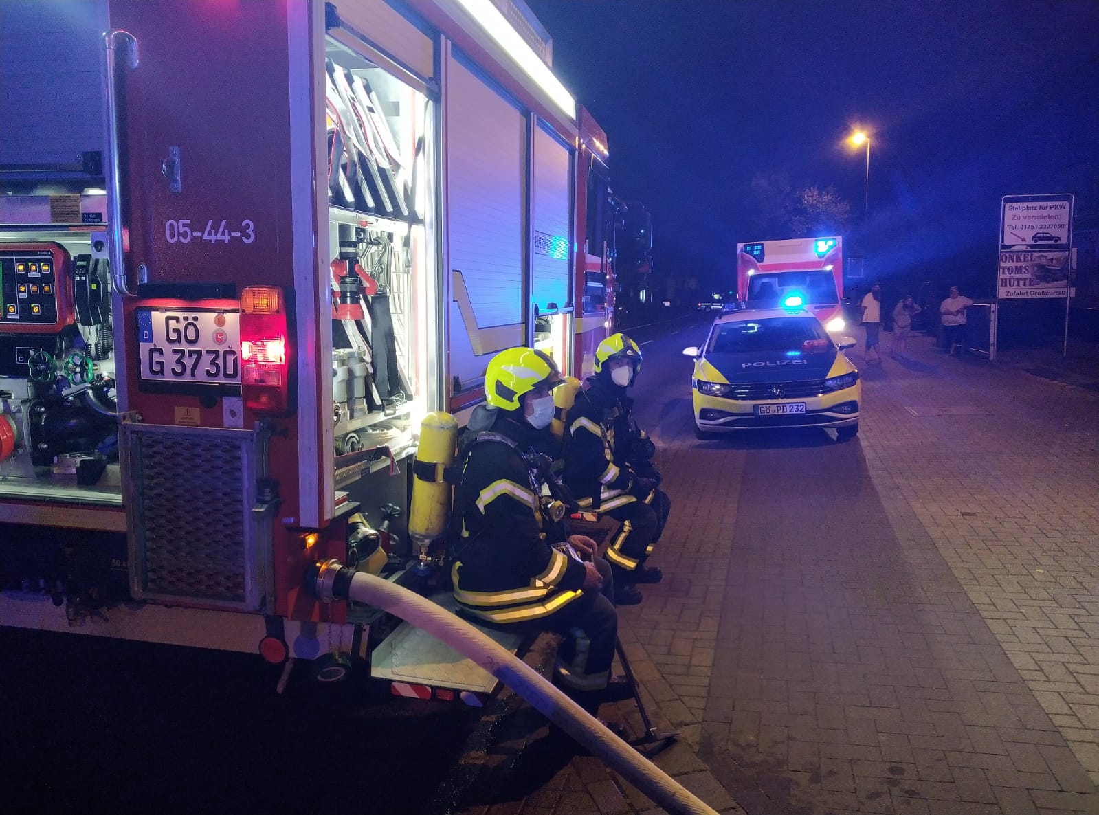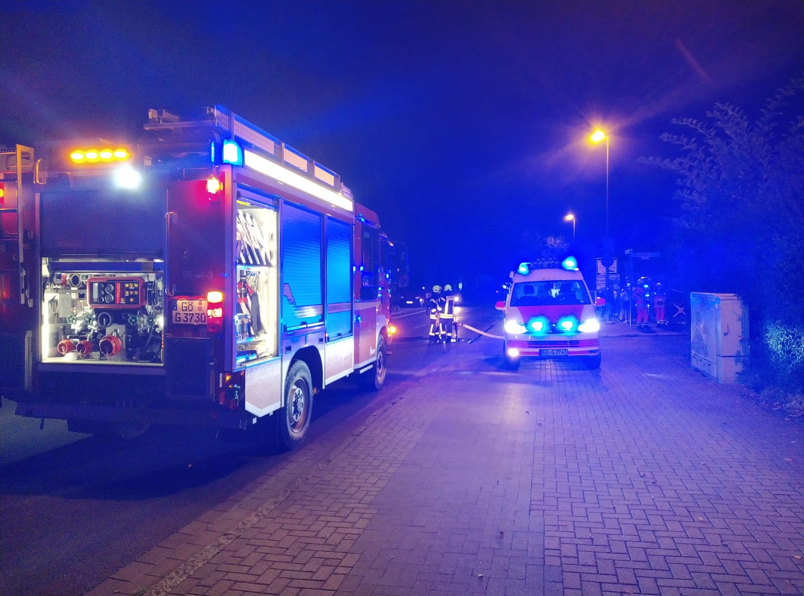 Dort brannte eine Gartenlaube in voller Ausdehnung. Die Berufsfeuerwehr war mit dem TLF 3000 vor Ort, von der Ortsfeuerwehr Geismar kamen das LF 20 Kats und der MTW zum Einsatz. Anfangs war das TroTLF ebenfalls vor Ort, konnte aber nach kurzer Zeit wieder aus dem Einsatz entlassen werden.