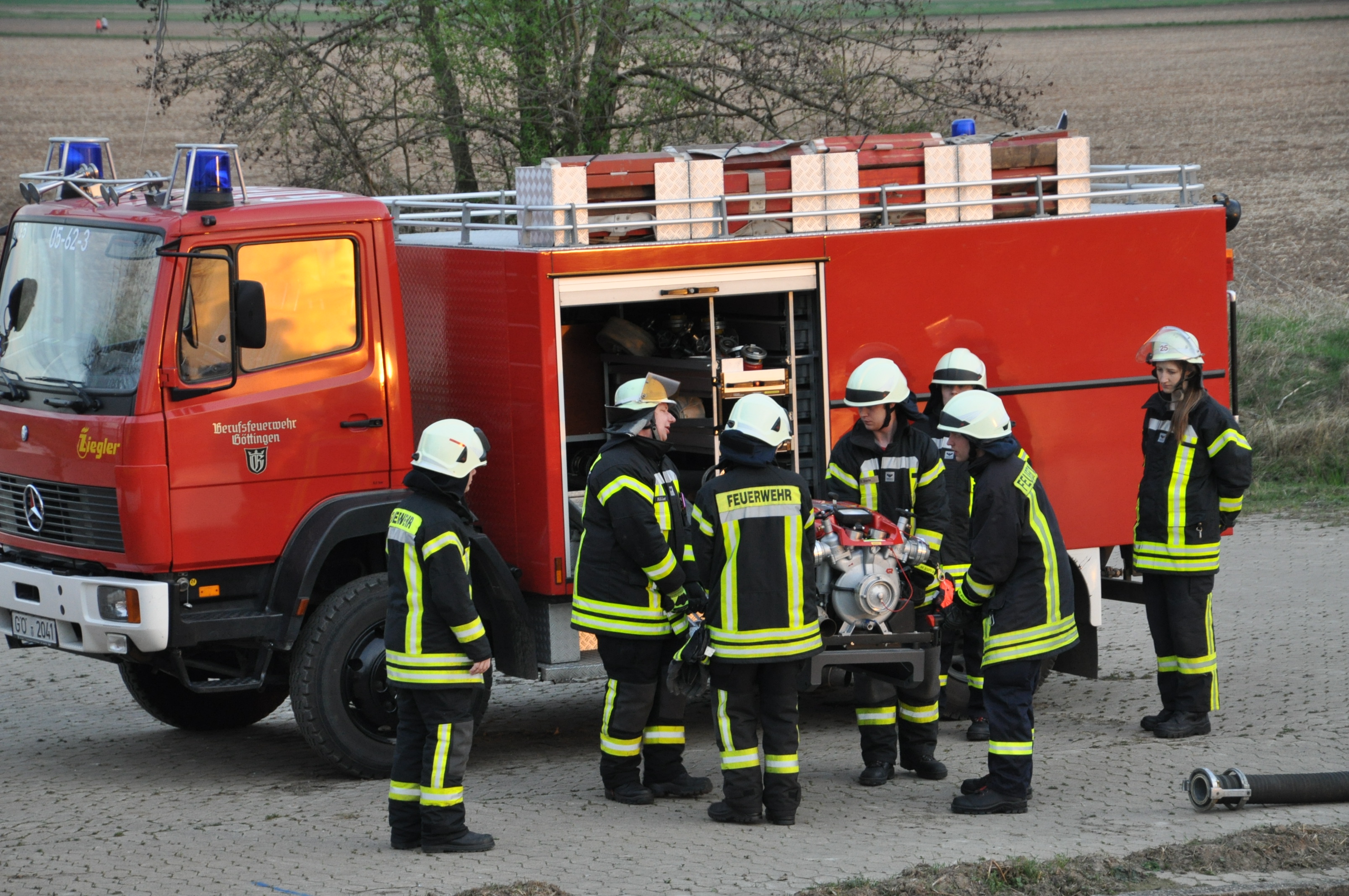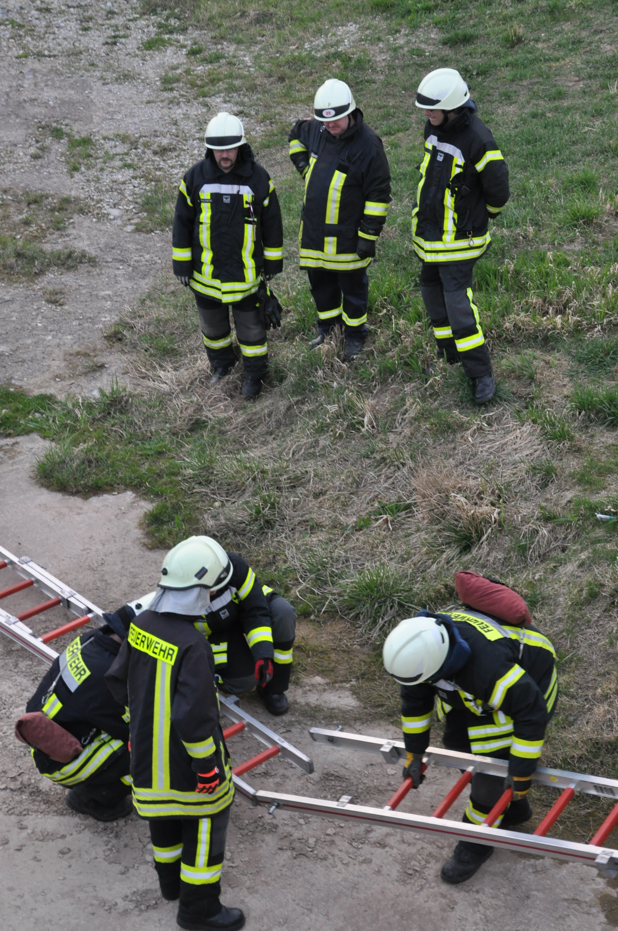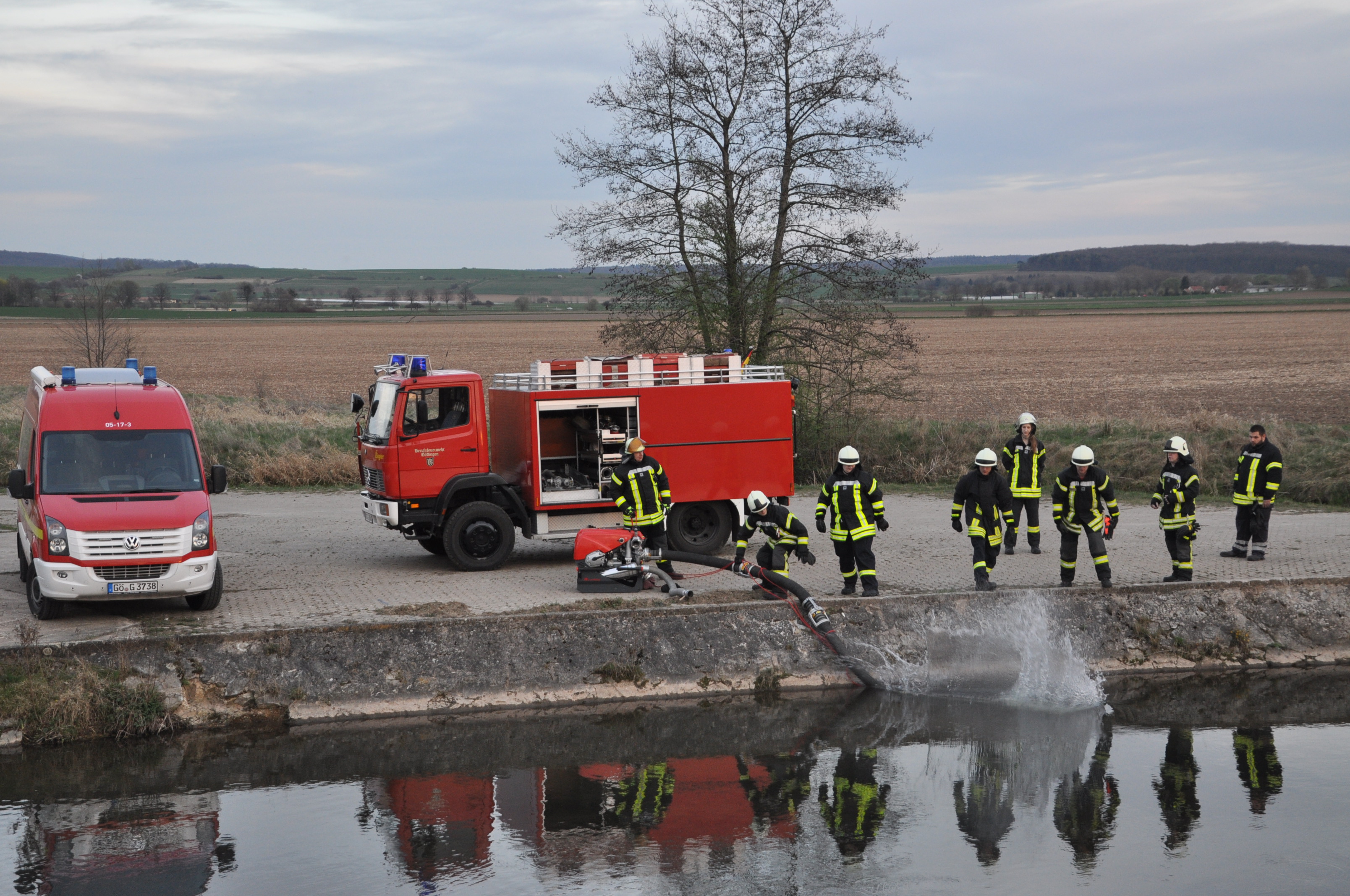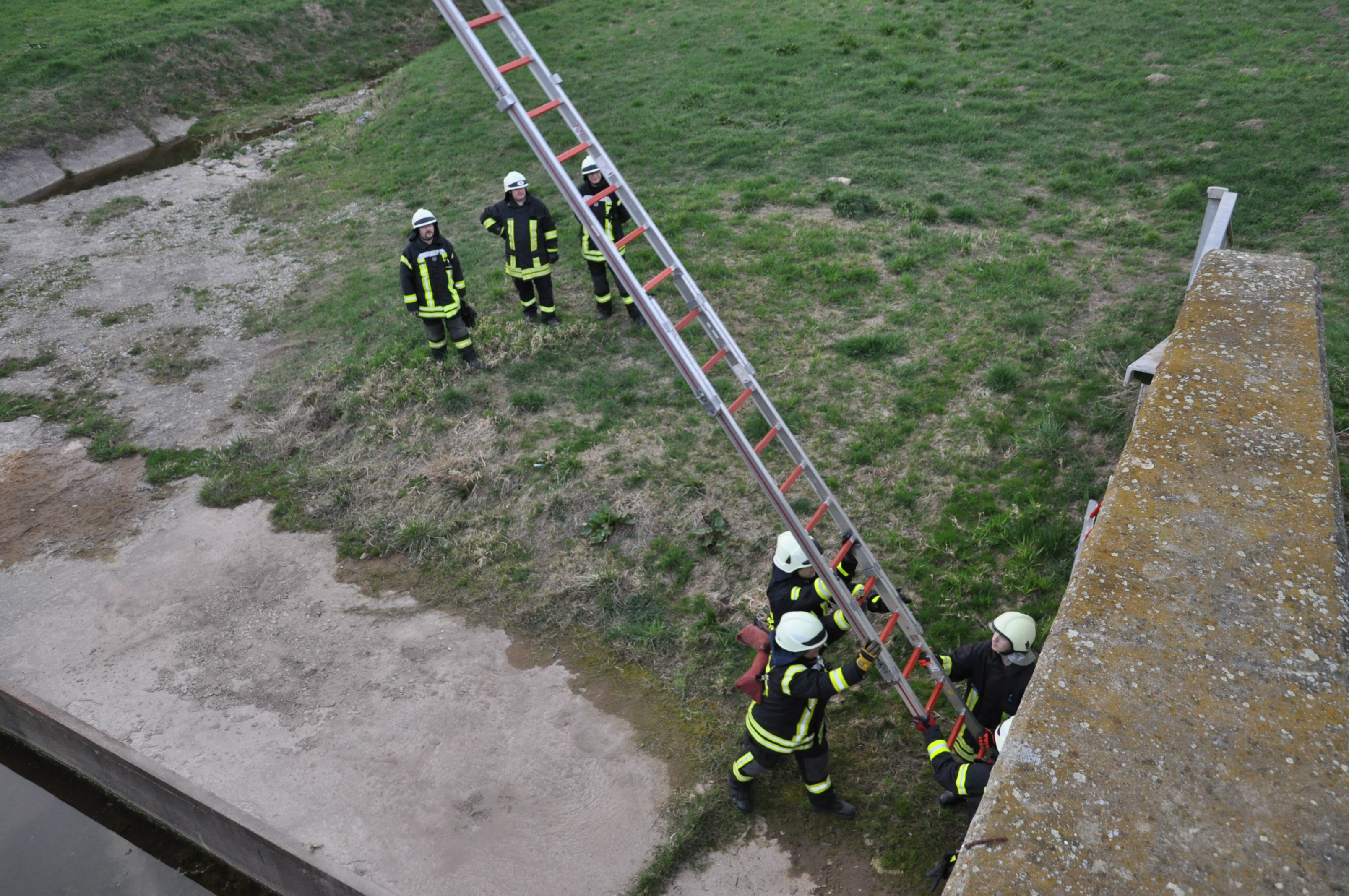 Am Flütewehr wurde auf der Südseite mit dem SW 2000 Tr und dem MTW die Wasserversorgung aus einem offenen Gewässer geübt. Die Nordseite war mit dem LF 20KatS, dem TroTLF 16 und dem GWN belegt. Hier wurde ein Löschangriff mit Bereitstellung aufgebaut bzw. die Handhabung der 4-teiligen Steckleiter mit Anleitern und Aufstieg durchgeführt.