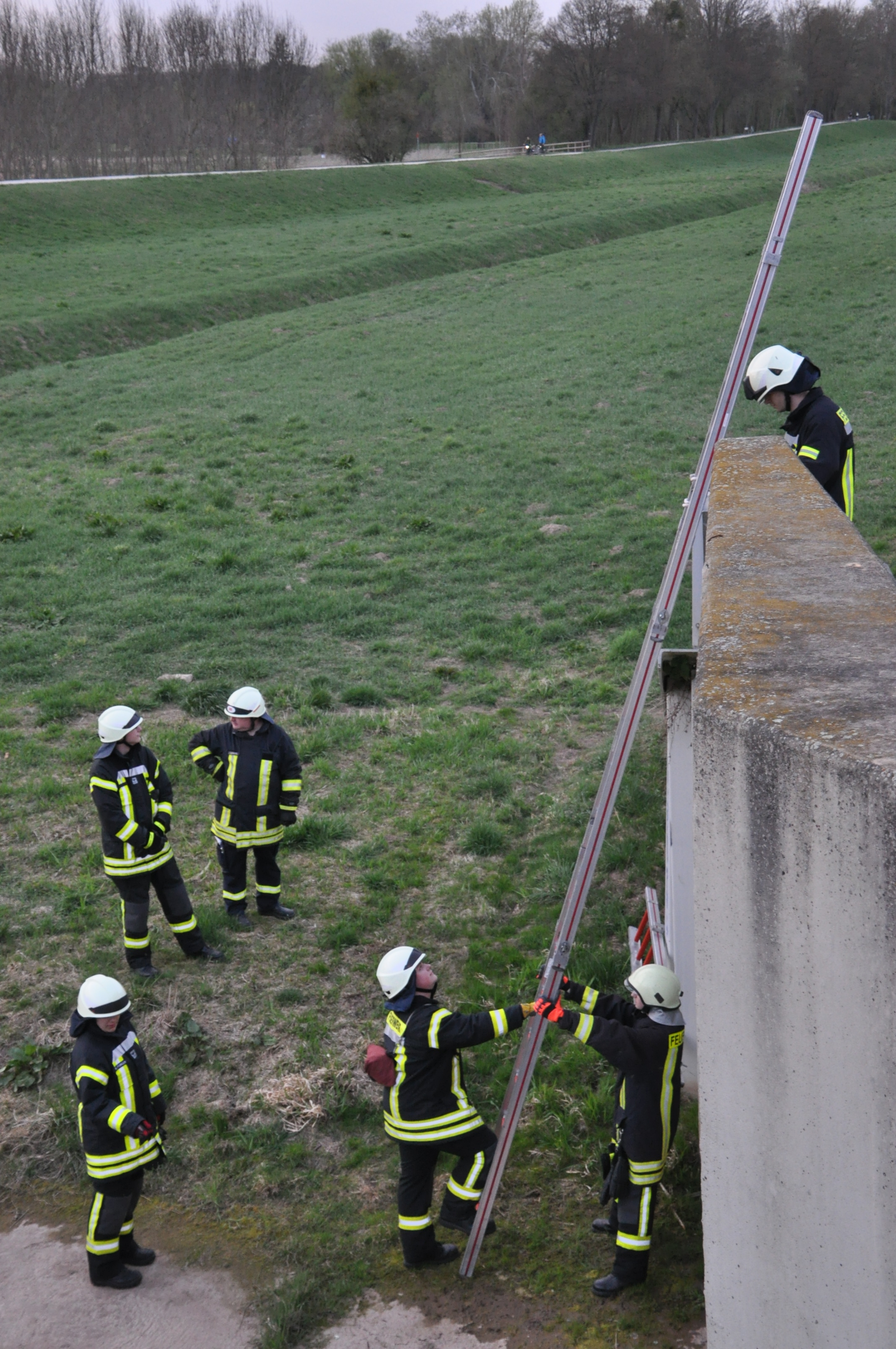 Am Flütewehr wurde auf der Südseite mit dem SW 2000 Tr und dem MTW die Wasserversorgung aus einem offenen Gewässer geübt. Die Nordseite war mit dem LF 20KatS, dem TroTLF 16 und dem GWN belegt. Hier wurde ein Löschangriff mit Bereitstellung aufgebaut bzw. die Handhabung der 4-teiligen Steckleiter mit Anleitern und Aufstieg durchgeführt.