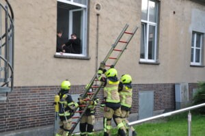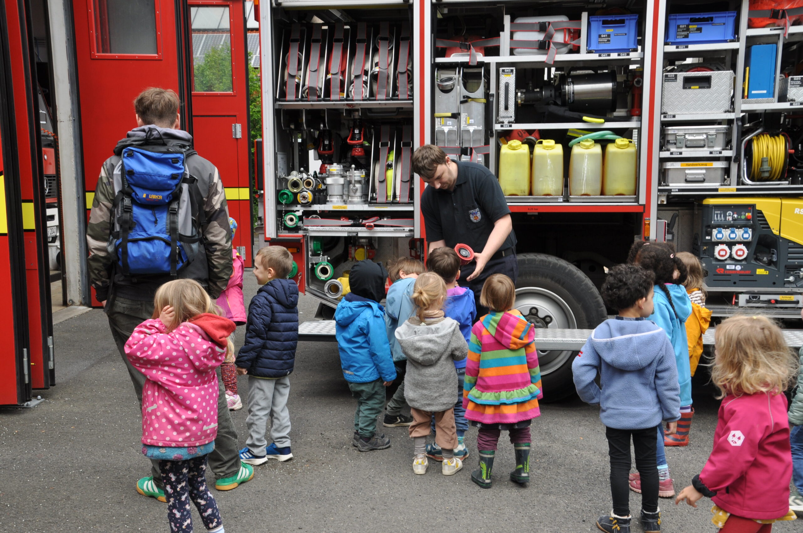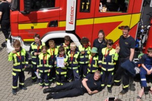Im Rahmen der Brandschutzerziehung hatten die Ortsfeuerwehr Geismar am Mittwochvormittag, den 24. Mai Besuch vom Kinderkarten KEI (Kindergarten in Eigeninitiative), der an der „Von-Ossietzky-Straße“ liegt, bekommen. Acht Betreuer und Eltern sowie 22 Mädchen + Jungen im Alter von 4-5 Jahren hatten sich zur Besichtigung zu 10.45 Uhr angesagt. Drei aktive Mitglieder versuchten den Kindern etwas über die „Feuerwehr“ zu vermitteln. Da wir alle Tore der Fahrzeughalle geöffnet hatten, konnte man die Kinder schon von der Hauptstraße aus „da ist die Feuerwehr“ rufen hören. Anfangs haben wir uns im U-Raum versammelt, um erst einmal festzustellen, was die Kinder so über das Thema Feuerwehr wissen und das war bereits eine Menge. Jeder kannte die Rufnummer 112 und die Kinder hatten uns sogar ein Feuerwehrlied mitgebracht, dass sie mit großer Lautstärke uns vorgesungen haben. Lange waren die Kids nicht im U-Raum zu halten. Jeder wollte natürlich die Fahrzeuge und die Einsatzbekleidung, sowie die Gerätschaften sich anschauen. Wir haben dann unser LF 20 KatS aus der Halle rausgefahren und alle Geräteräume geöffnet. Natürlich durfte jeder auch mal ins „Feuerwehrauto“ einsteigen und sich als richtiger Feuerwehrmann fühlen. Interessant waren auch manche Gerätschaften wie z.B. die Strahlrohre. Im Laufe der Vorstellung durften die Kids sich auch mal mit Helm und Einsatzjacke ausrüsten, was manchen viel Spaß machte. Das Highlight war dann zum Schluss das Spiel mit dem Wasser. Jeder durfte noch mit einem D-Strahlrohr unserer Kübelspritze an unserer Spritzwand kleine „Flammen“ umschießen. Nach rund einer guten Stunde ging es wieder zurück zum Kindergarten und die Kids konnte man ansehen, dass der Besuch ihnen einen riesigen Spaß gemacht hat. Und ich muss auch für uns sagen: „So etwas könnte man jede Woche machen, da die Arbeit mit den Kids auch uns unwahrscheinlich viel gegeben hat.