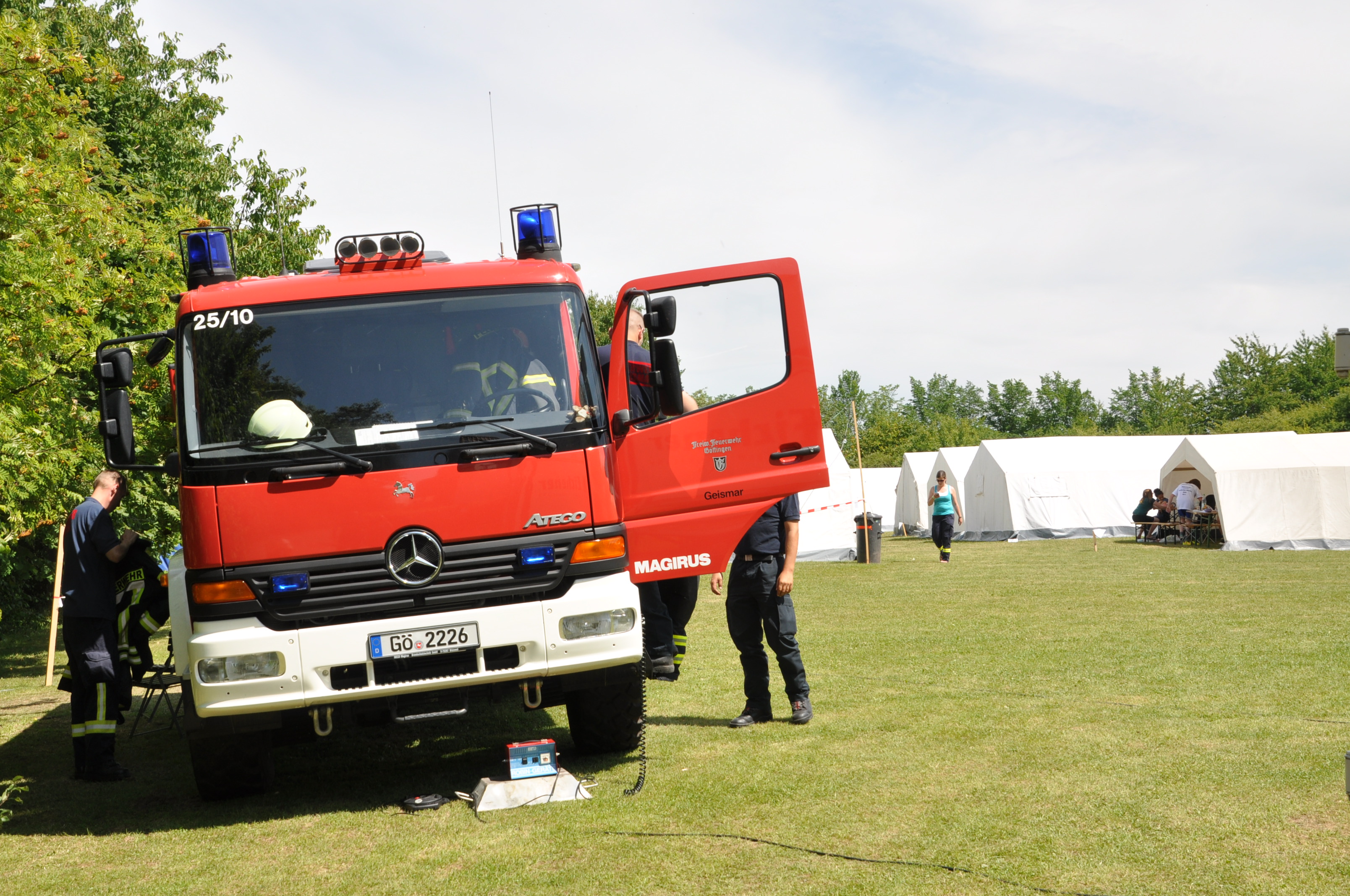 Die Ortsfeuerwehr Geismar hatte an diesem Wochenende die Aufgabe, den Brandschutz für das Zeltlager mit seinen rund 800 Teilnehmern (incl. Betreuern), sicherzustellen. Die Zelte waren auf drei aneinander liegenden Plätzen verteilt.