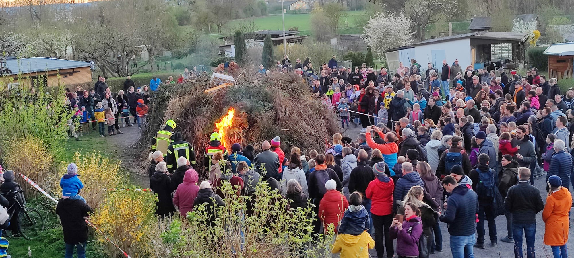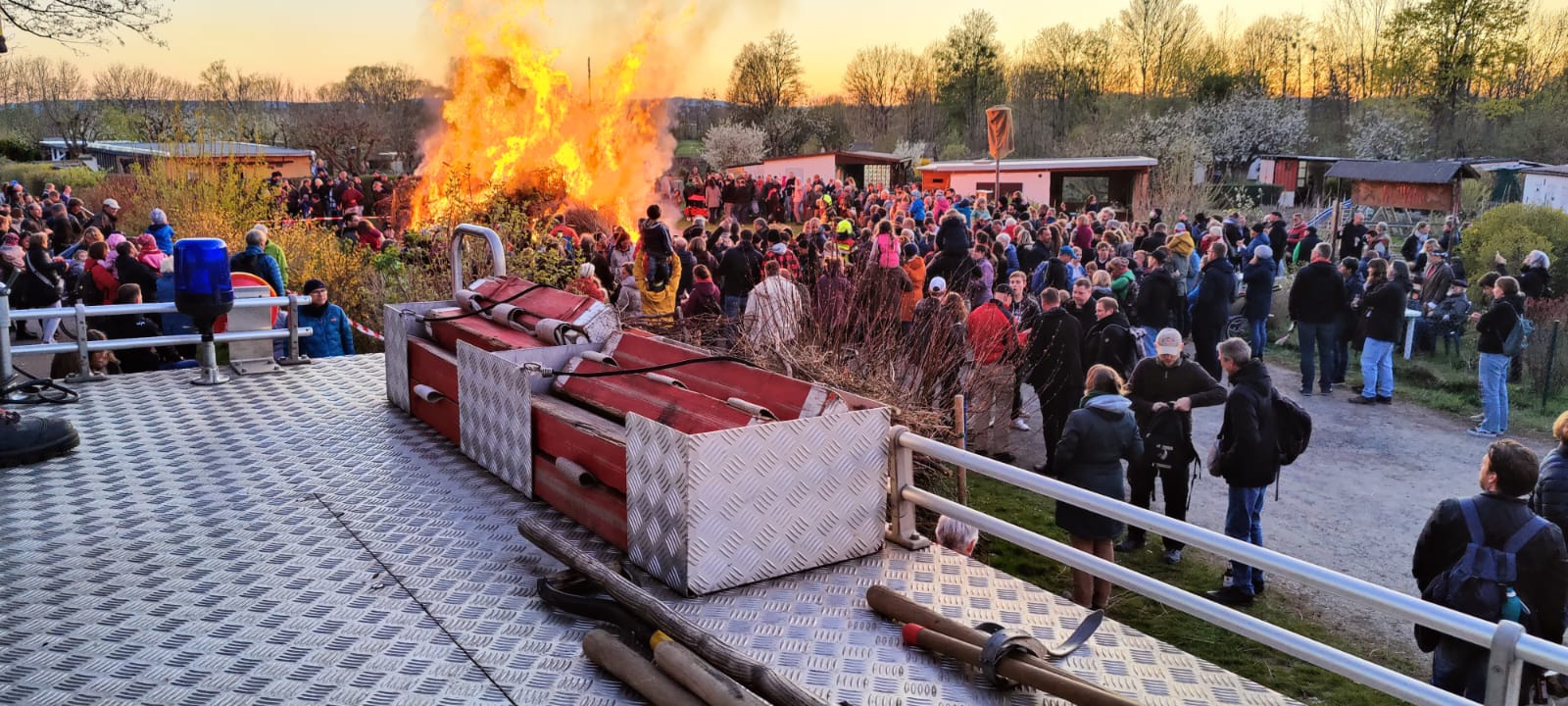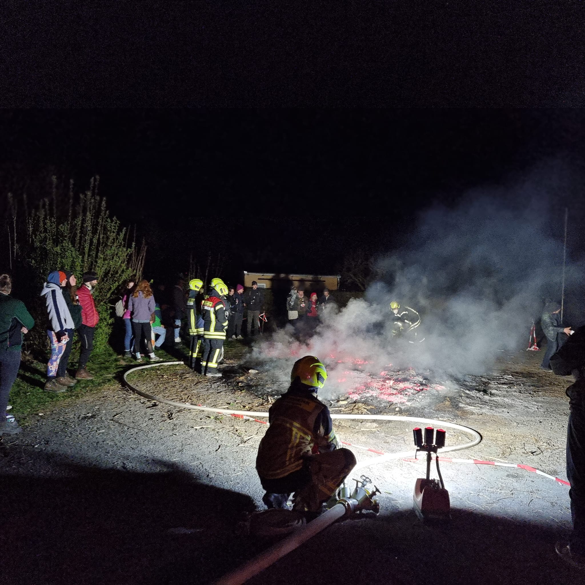 So war es aber möglich, dass wir eine Brandsicherheitswache beim Osterfeuer des Kleingartenvereins „Am Wehr“ durchführen konnten. Die Vereinsmitglieder hatten auf dem hinteren, südlichen Parkplatz einen riesigen Haufen Strauch-und Baumabschnitt aufgestapelt. Unser TroTLF 16, besetzt mit 1/5 Kräften war von 19.15 Uhr bis 23.30 Uhr vor Ort. Die Kräfte unterstüzten beim Anzünden und sorgten dafür, dass das Feuer nicht auf Gärten oder Gartenlauben übergreifen konnte. Eine große Anzahl von Besuchern erfreute sich den Abend bei heißen Bratwürstchen und kühlen Getränken am Feuer. Es herrschte eine ruhige und gesellige Stimmung. Gegen 23.00 Uhr wurde dann mit Hilfe von rund 1.700 Liter Wasser, sowie einem C- und einem B-Rohr die restliche Glut abgelöscht. Teilweise kam noch ein Dunkhaken zum Einsatz, um auch an die letzten Glutnester heranzukommen. Nach einer Endkontrolle um 23.30 Uhr rückten unsere Kameraden mit dem Fahrzeug wieder ein.