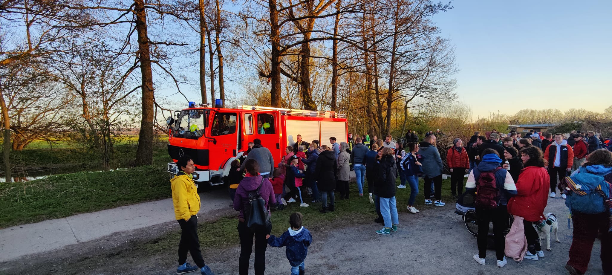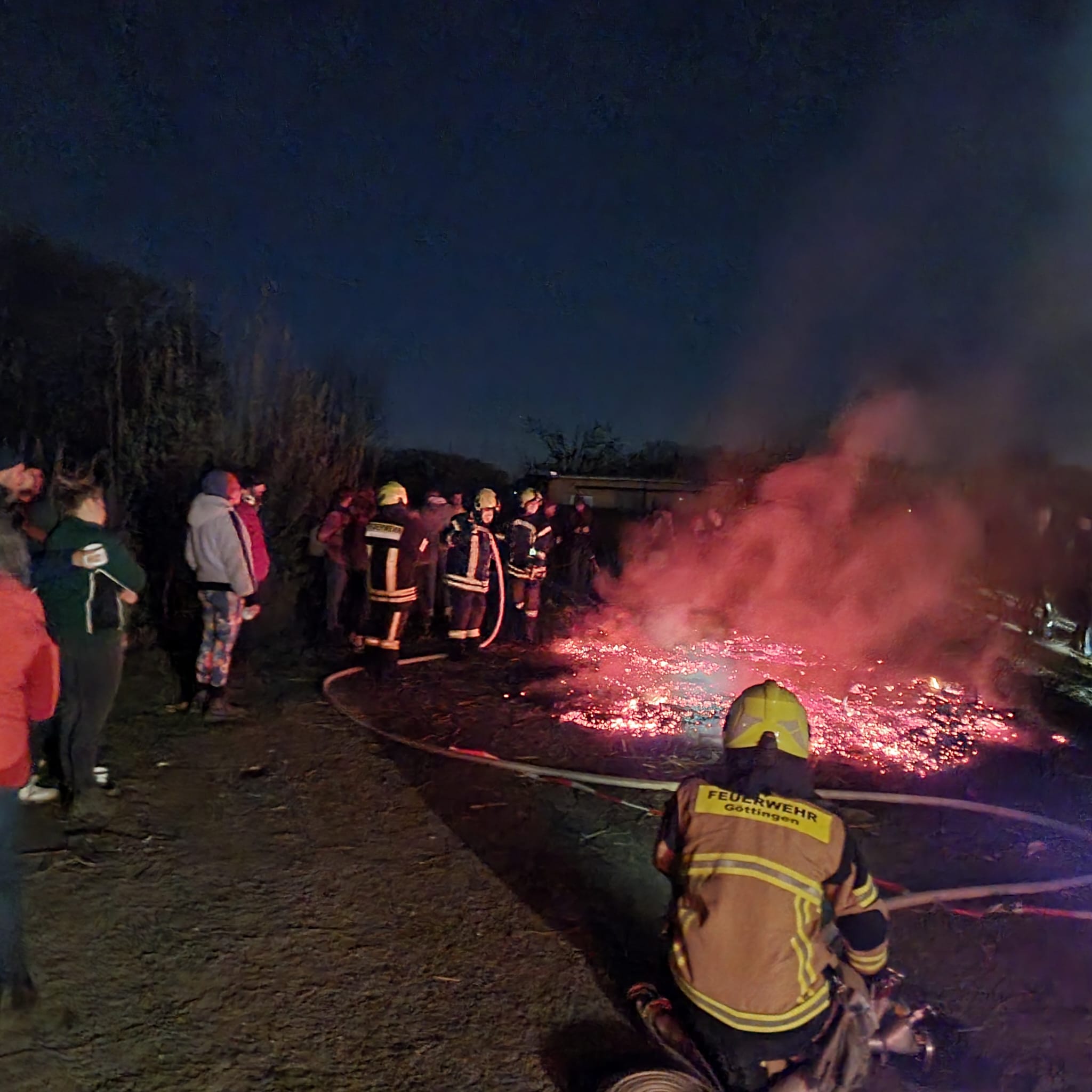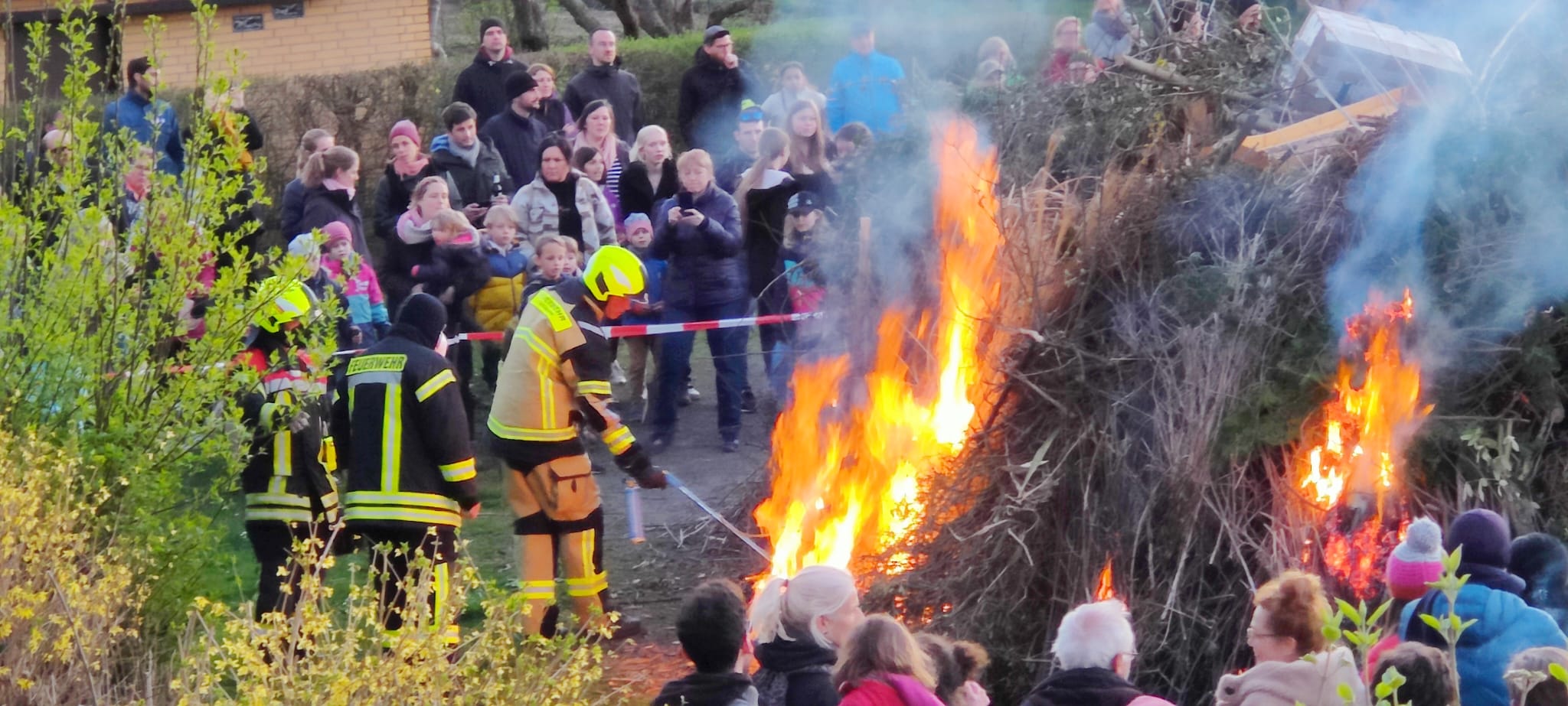 So war es aber möglich, dass wir eine Brandsicherheitswache beim Osterfeuer des Kleingartenvereins „Am Wehr“ durchführen konnten. Die Vereinsmitglieder hatten auf dem hinteren, südlichen Parkplatz einen riesigen Haufen Strauch-und Baumabschnitt aufgestapelt. Unser TroTLF 16, besetzt mit 1/5 Kräften war von 19.15 Uhr bis 23.30 Uhr vor Ort. Die Kräfte unterstüzten beim Anzünden und sorgten dafür, dass das Feuer nicht auf Gärten oder Gartenlauben übergreifen konnte. Eine große Anzahl von Besuchern erfreute sich den Abend bei heißen Bratwürstchen und kühlen Getränken am Feuer. Es herrschte eine ruhige und gesellige Stimmung. Gegen 23.00 Uhr wurde dann mit Hilfe von rund 1.700 Liter Wasser, sowie einem C- und einem B-Rohr die restliche Glut abgelöscht. Teilweise kam noch ein Dunkhaken zum Einsatz, um auch an die letzten Glutnester heranzukommen. Nach einer Endkontrolle um 23.30 Uhr rückten unsere Kameraden mit dem Fahrzeug wieder ein.