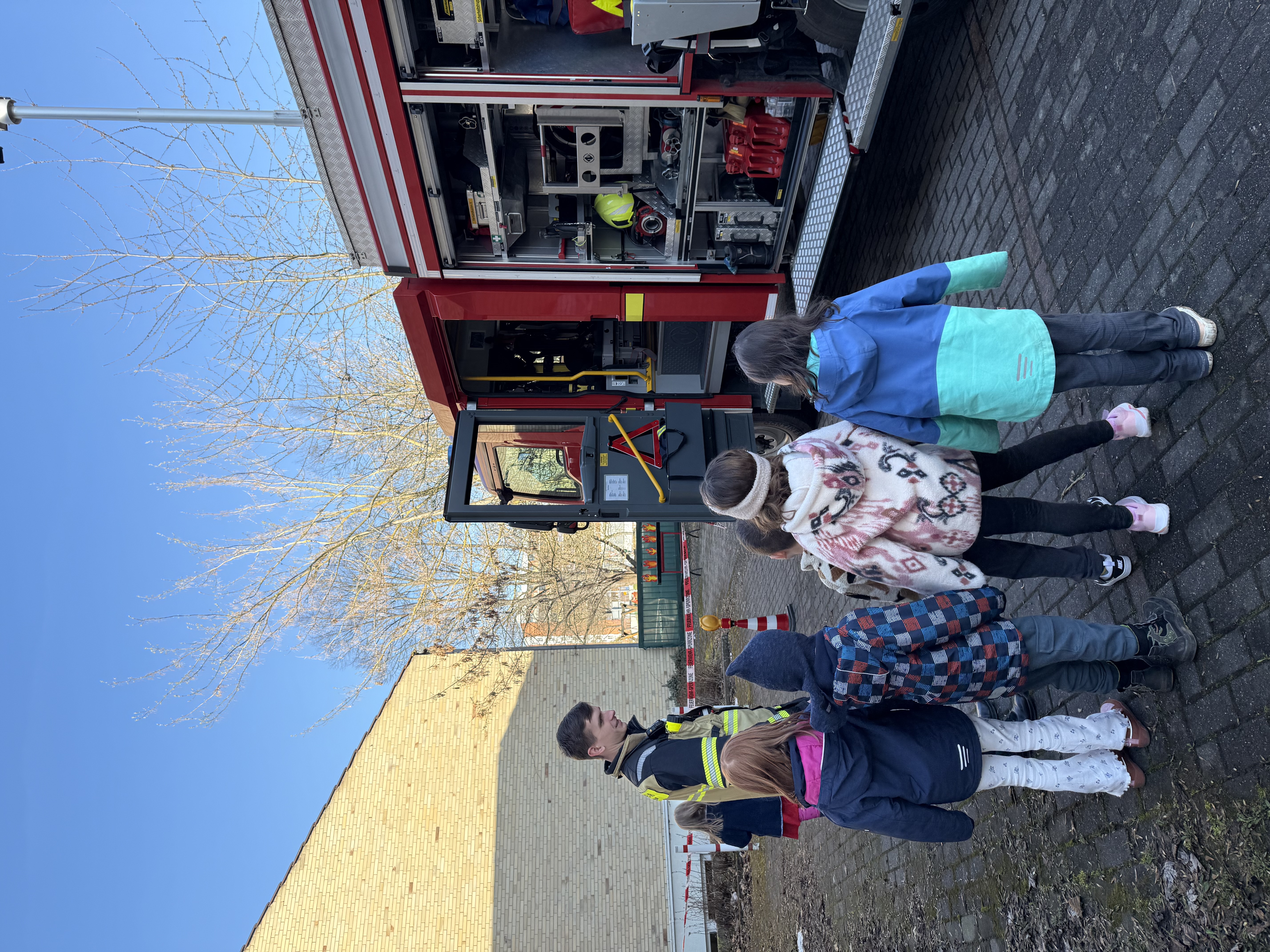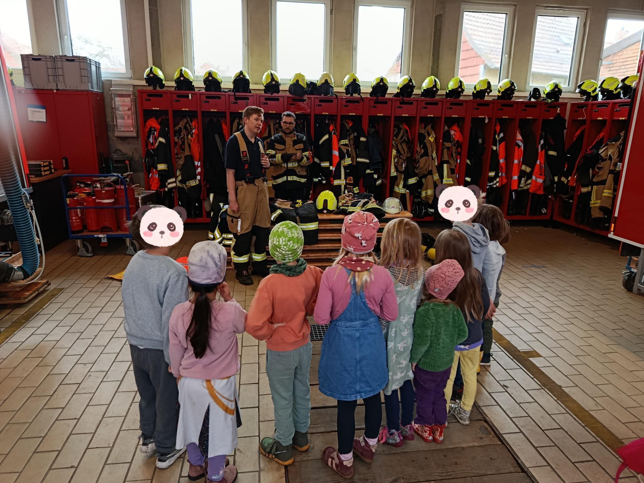 Am Mittwoch, den 18. März hatte uns der Sportkindergarten e.V. am Waldweg eingeladen. Hier waren wir mit unserem Löschfahrzeug LF 20 KatS und vier Aktiven von 09.30 bis 12.00 Uhr vor Ort. Auch diese Gruppe aus insgesamt 21 Jungen und Mädchen, unter der Leitung von Chefin Tamara, hatte für uns ein super Lied einstudiert. Auch hier waren wir völlig „buff“, da uns das erst das zweite mal passiert ist. Wir konnten dann dann mit den Vorschulkindern bzw. den Minis zwei Gruppen bilden. Im Spielzimmer haben wir die unterschiedlichen Einsatzanzüge und Helme vorgestellt und draußen auf dem Hof konnte wieder das Löschfahrzeug besichtigt und bestiegen werden. Bei bestem Wetter konnten sich alle Kids diesmal wieder an der Spritzwand austoben. Zum Abschluss hatte sich einer von uns (der Aaron) komplett mit Einsatzanzug, Atemschutzmaske und der gelben Atemluftflasche auf dem Rücken ausgestattet, um den Kindern zu zeigen, dass sie vor so einem Feuerwehrmann keine Angst haben müssen. Was furchterregend aussah, ist für uns Feuerwehrleute aber im Einsatz lebenswichtig.