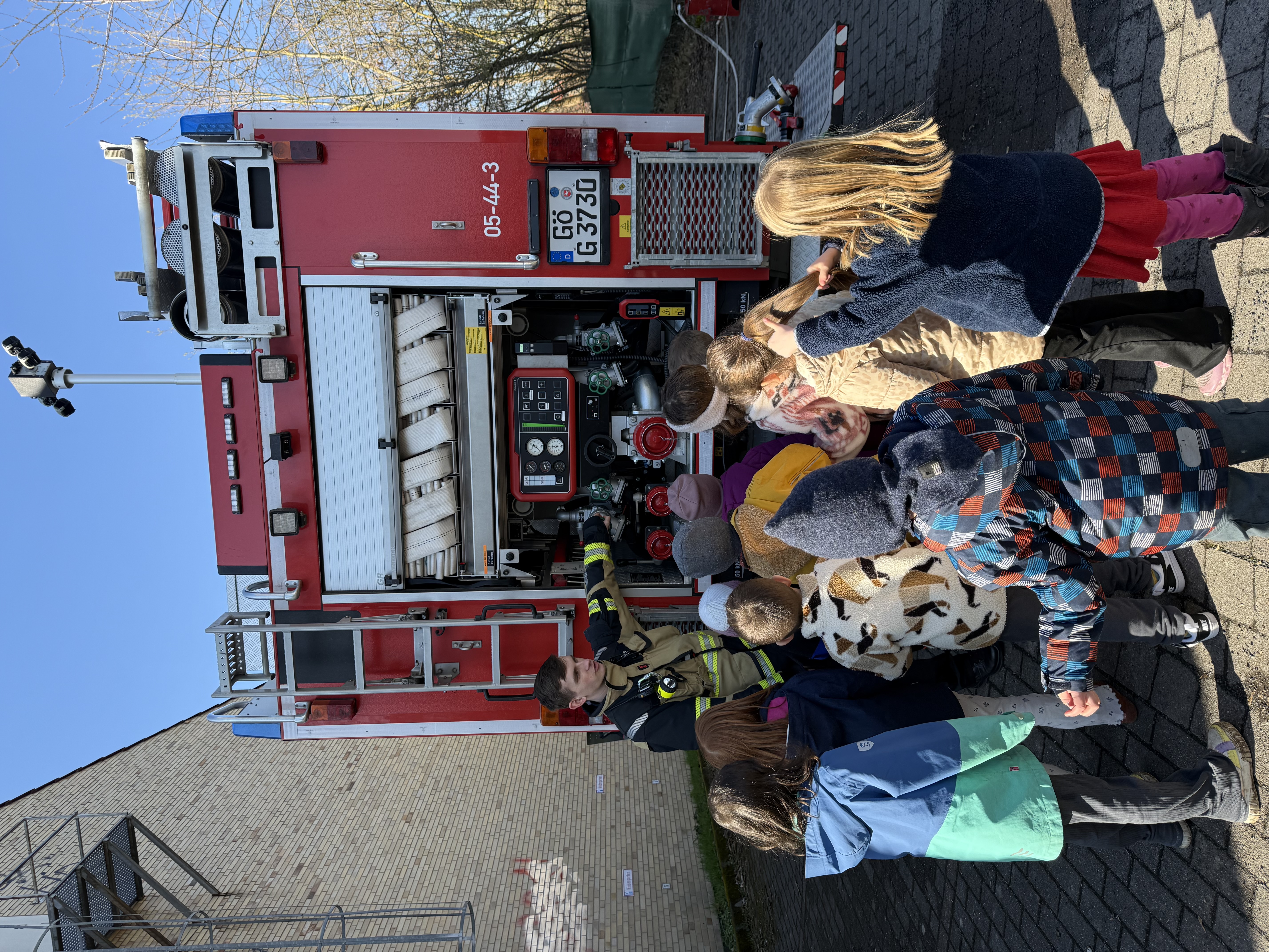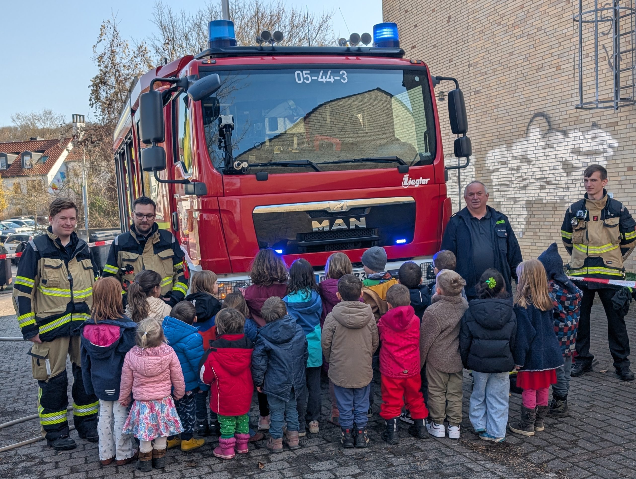 Gleich dreimal hatten wir im Monat März viel Spaß bei der Brandschutzerziehung mit Kids aus verschiedenen Kindergärten. Den Anfang machte am Donnerstag, den 05. März der Kindergarten St. Martin an der Charlottenburger Straße. Drei Betreuerinnen und 15 Kids im Alter von 3-6 Jahren machten sich morgens zu Fuß (!!) auf den Weg zum Feuerwehrhaus in der Kerllsgasse. Als die Gruppe über unseren Hof spazierte, waren schon die leuchtenden Kinderaugen deutlich erkennbar. Am Anfang stand eine kurze Information über das Feuerwehrwesen in Göttingen, sowie über unsere Feuerwehr an. Aufgeteilt in drei Gruppen haben wir einmal unser Löschfahrzeug, das LF 20 KatS, mit allen Gerätschaften vorgestellt. Highlight war natürlich ins Löschfahrzeug zu klettern, um entweder hinten im Mannschaftsraum, oder sich auch vorne hinters Lenkrad zu setzten und mal auf dem „Chefsessel“ sitzen zu dürfen. Bei der zweiten Station, in der Halle, wurden die Einsatzkleidung erklärt und natürlich auch mal anprobiert. Und bei der dritten Station durften die Kinder mit einem „D-Strahlrohr“ die „Flammen“ richtig mit Wasser auf unserer Spritzwand löschen, oder sich selbst mal an der Kübelspritze betätigen. Wir waren an diesem Vormittag mit 5 aktiven Mitgliedern vor Ort. Allen hat es einen riesigen Spaß gemacht. Nach rund 2 Stunden ging es wieder zurück zum Kindergarten, ebenfalls zu Fuß (!!) und wir verabschiedeten die Kids natürlich mit Blaulicht und lautem Martinshorn.