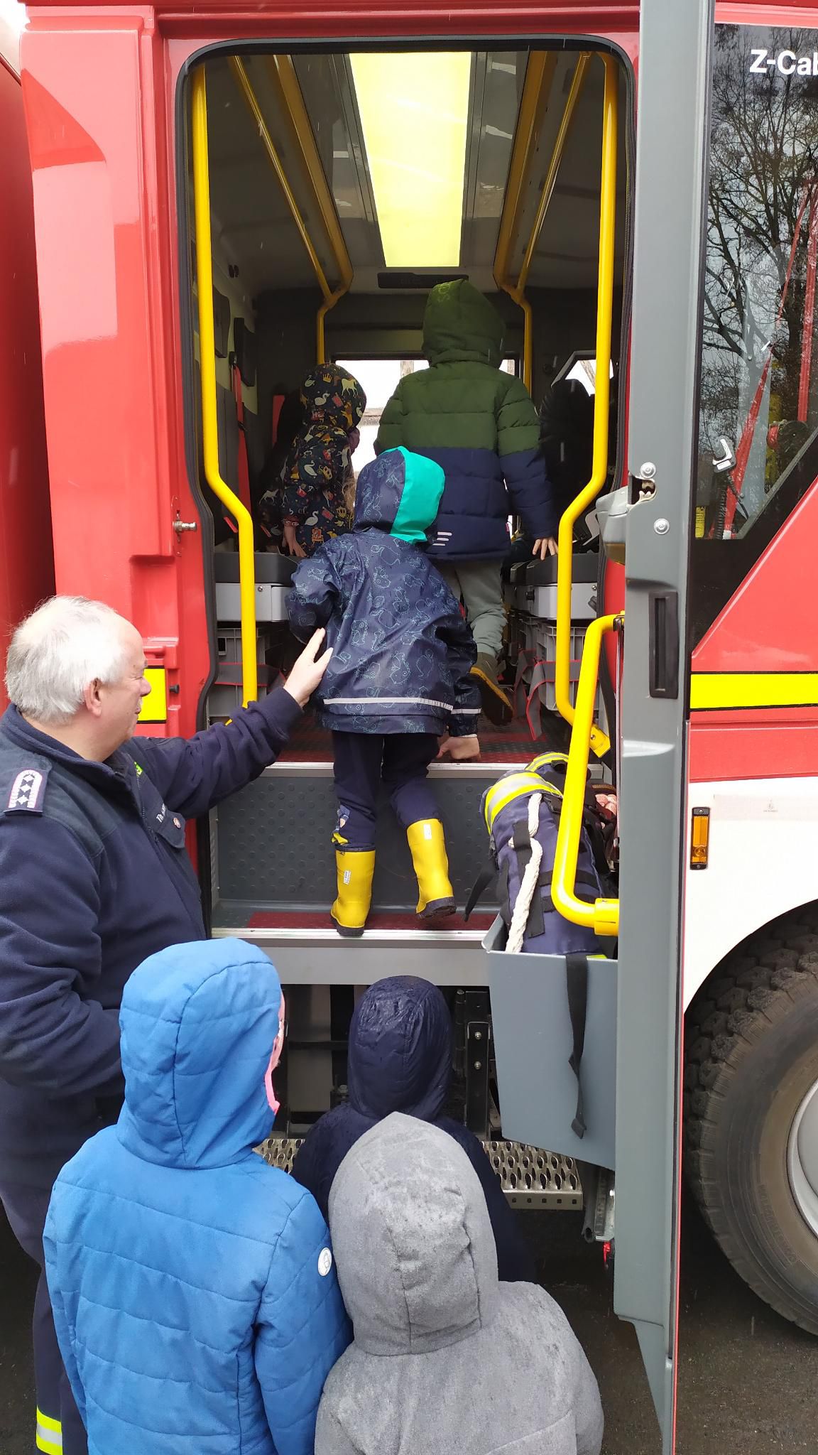 Am Montag, den 16. März kamen dann 22 Kids mit 3 Betreuerinnen der „Panda“-Gruppe von der AWO KITA an der Tilsiter Straße. An diesem Morgen wurden wir von der Gruppe völlig überrascht. Wir hatten ja schon einige Kindergarten- bzw. Schulgruppen zur Brandschutzerziehung bei uns. Aber die Panda-Gruppe hatte extra für uns ein tolles Lied einstudiert und die Kids sagen mit voller Lust uns das Lied vor. Das war die erste Gruppe, die uns ein Lied präsentiert hatten. Hinterher waren „wir“ völlig aus dem Häuschen und fühlten uns total überrascht und ergriffen. Leider konnten wir, wegen des schlechten Wetters nicht alles dass, was wir uns vorgenommen hatten, durchführen. Aber auch so gaben wir unser Bestes und bespassten die Kids rund 2 Stunden lang mit Fahrzeugbesichtigung und vieles mehr.