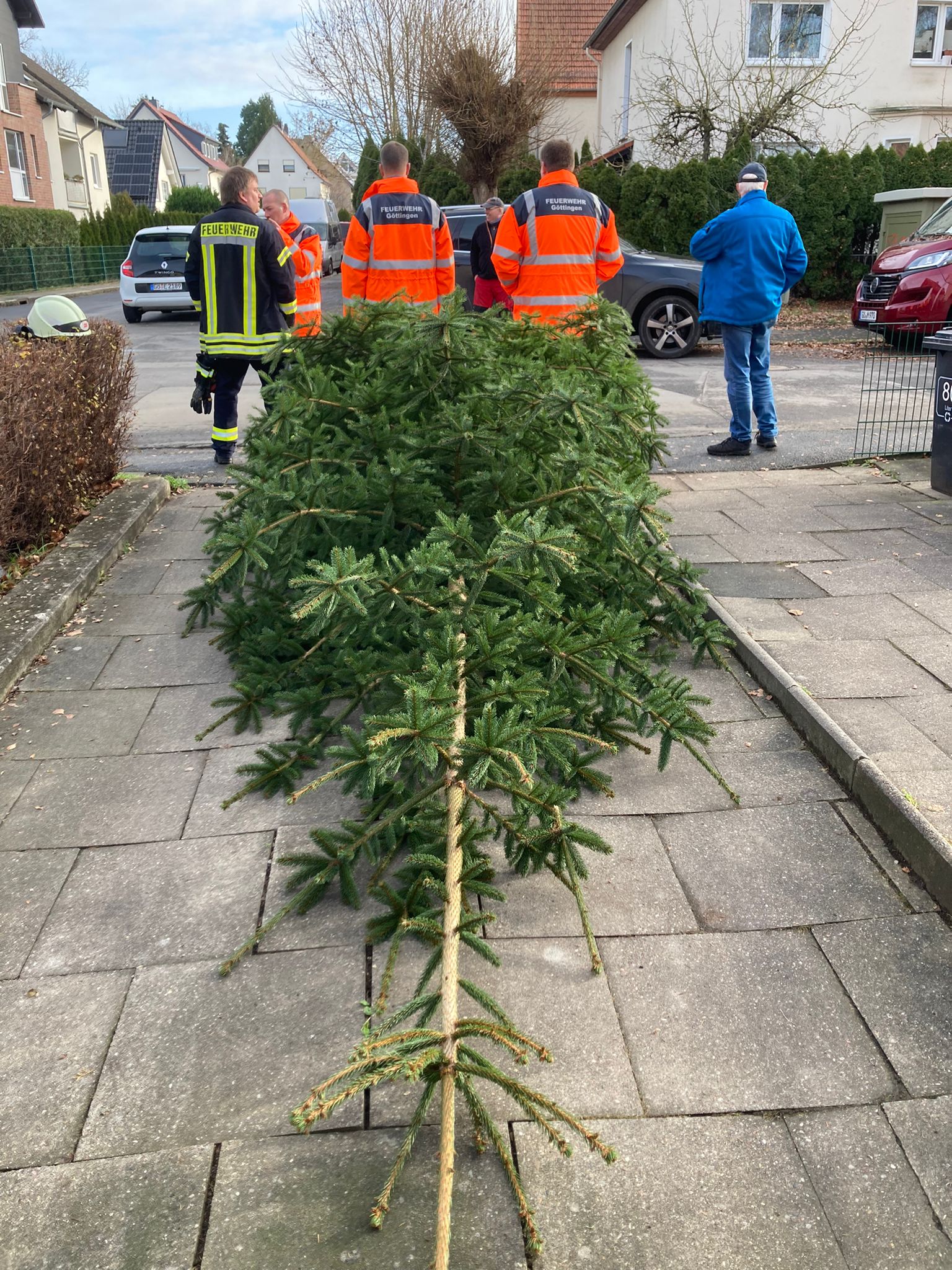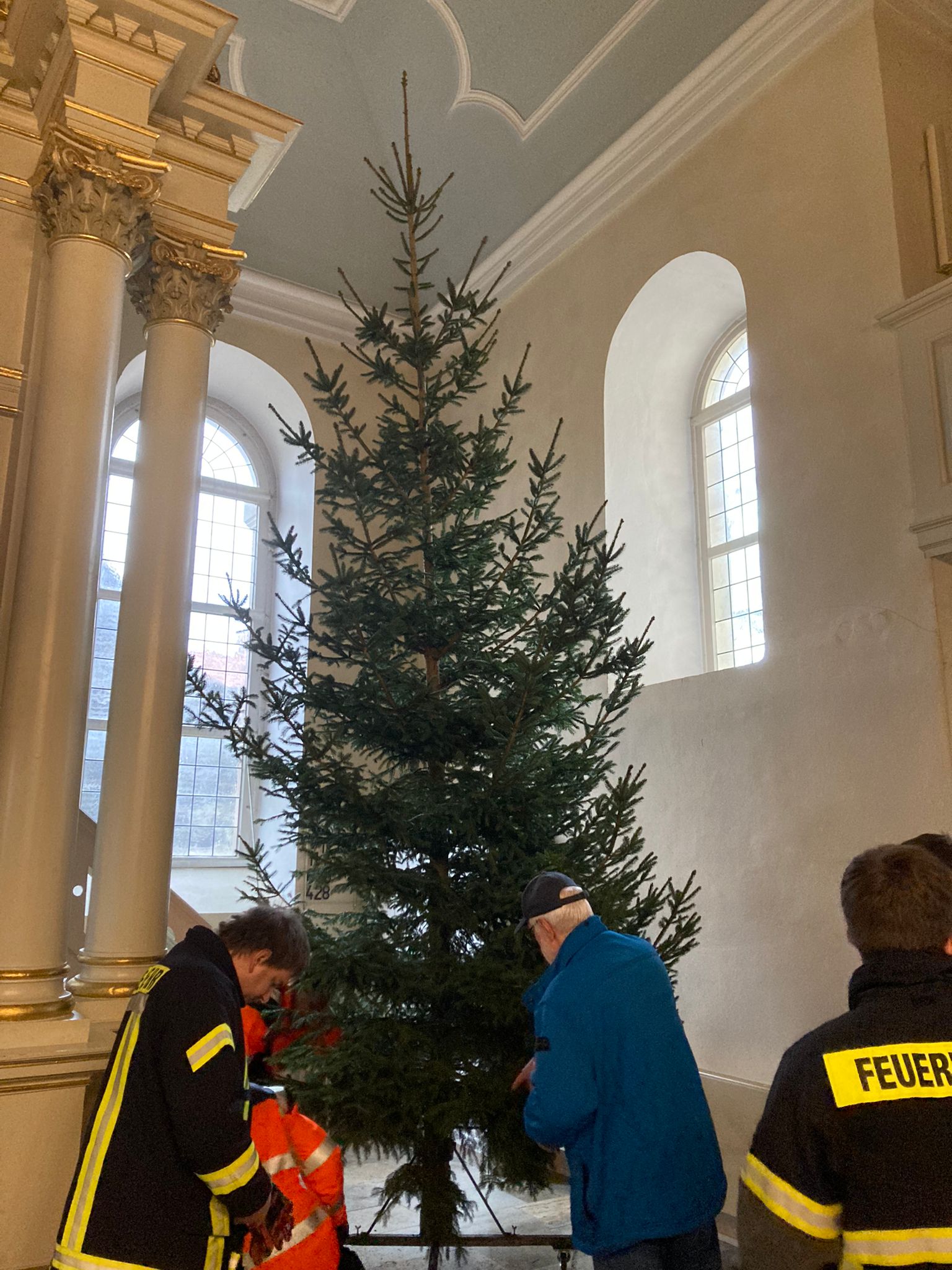 Wie in jedem Jahr zu Weihnachten war auch in 2023 die Ortsfeuerwehr Geismar zuständig, den Weihnachtsbaum für die St. Martinskirche zu holen und aufzustellen. Und so machten sich 6 Mitglieder der OF Geismar am Samstag, den 16. Dezember auf zum „Akazienweg“. Dort hatte ein Bürger den Tannenbaum der St. Martingemeinde gespendet. Die Tanne wurde professionell „gefällt“ und zur Kirche transportiert. Das Aufstellen klappte in diesem Jahr ohne besondere Vorkommnisse. Das Ganze nahm rund eine Stunde in Anspruch und nun steht der Weihnachtsbaum in voller Pracht im Kirchenschiff neben dem Altar.