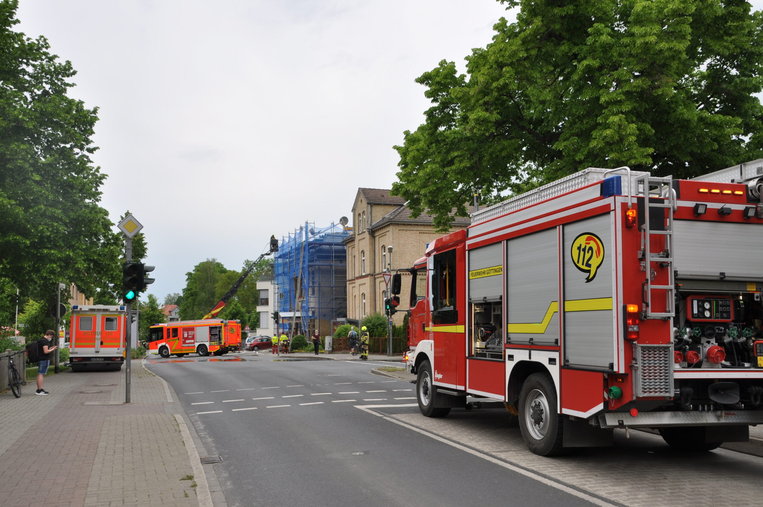 Am Donnerstagnachmittag, den 03. Juni wurde die Ortsfeuerwehr Geismar um 16.51 Uhr über DME zu einem Dachstuhlbrand eines Wohn- und Geschäftshauses in der Geismar Landstraße alarmiert. Zusätzlich zum Löschzug der Berufsfeuerwehr wurden auch die HLF`s der Wache West und der Wache Klinikum sowie die OF Stadtmitte ebenfalls in den Einsatz eingebunden. Bei Ankunft an der Einsatzstelle war eine starke Rauchentwicklung im Dachbereich erkennbar. Es brannten Baumaterialien auf dem Dach. Zum Einsatz kamen ein C-Rohr und die Drehleiter. Nach gut zehn Minuten war das Feuer unter Kontrolle, sodass das HLF West und die OF Stadtmitte Ihre Einsatzfahrten abbrachen. Um 17.09 Uhr konnte bereits „Feuer aus“ gemeldet werden. Die OF Geismar rückte mit dem LF 20 KatS (1/8) und dem TroTLF 16 (1/5) an, hatte aber wie bei den vorherigen Einsätzen auch, keine Tätigkeiten an der Einsatzstelle und rückte somit um 17.29 Uhr wieder einsatzbereit ins Feuerwehrhaus Geismar ein.