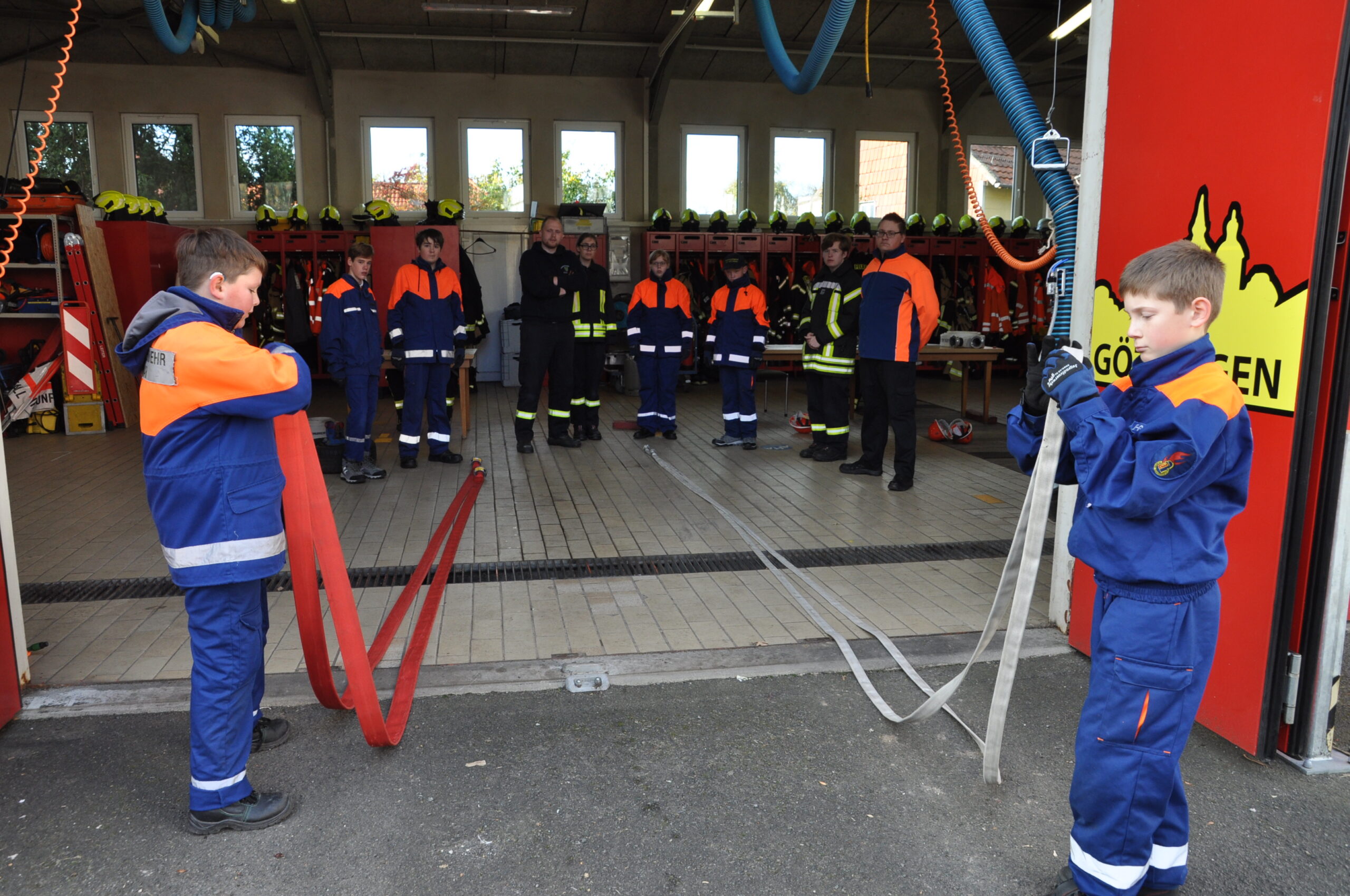 Am Samstag, den 04. November fand in und um das Feuerwehrhaus Geismar die Annahme der Jugendflamme Teil 1+2 der Jugendfeuerwehren der Stadt Göttingen statt. Rund 50 Mädchen und Jungen aus fünf Jugendwehren hatten sich ab 09.00 Uhr auf dem Gelände an der Kerllsgasse getroffen. Mit dabei waren die Jugendfeuerwehren Weende , Herberhausen, Holtensen, Elliehausen/Esebeck und natürlich die Gastgeber aus Geismar. Für den Teil 1 waren 34 Jugendliche gemeldet. Hier ging es u.a. um einen korrekten Notruf abzusetzen, verschiedene Konten und Stiche zu beherrschen, Aus- und einrollen von Schläuchen, Handhabung von Verteiler und Strahlrohr, ein Hydrantenschild richtig zu erklären und eine zusammengeklappte Krankentrage aufzubauen. Beim Teil 2, hierfür hatten sich 16 Jugendliche angemeldet, ging es um Gerätekunde, einen improvisierten Wasserwerfer aufzubauen, ein Standrohr richtig zu setzten und ein Einsatzfahrzeug verkehrstechnisch abzusichern. In den Pausen war natürlich auch für das leibliche Wohl gesorgt. Es gab Bratwurst, Krakauer und Pommes, sowie Kaltgetränke. Gegen 12.30 Uhr fand dann in der Fahrzeughalle die Siegerehrungen statt. Alle 50 Mitwirkenden hatten entweder den Teil 1 oder Teil 2 bestanden. Nacheinander wurden die Jugendwehren aufgerufen, um sich dann die begehrte Anstecknadel abzuholen.