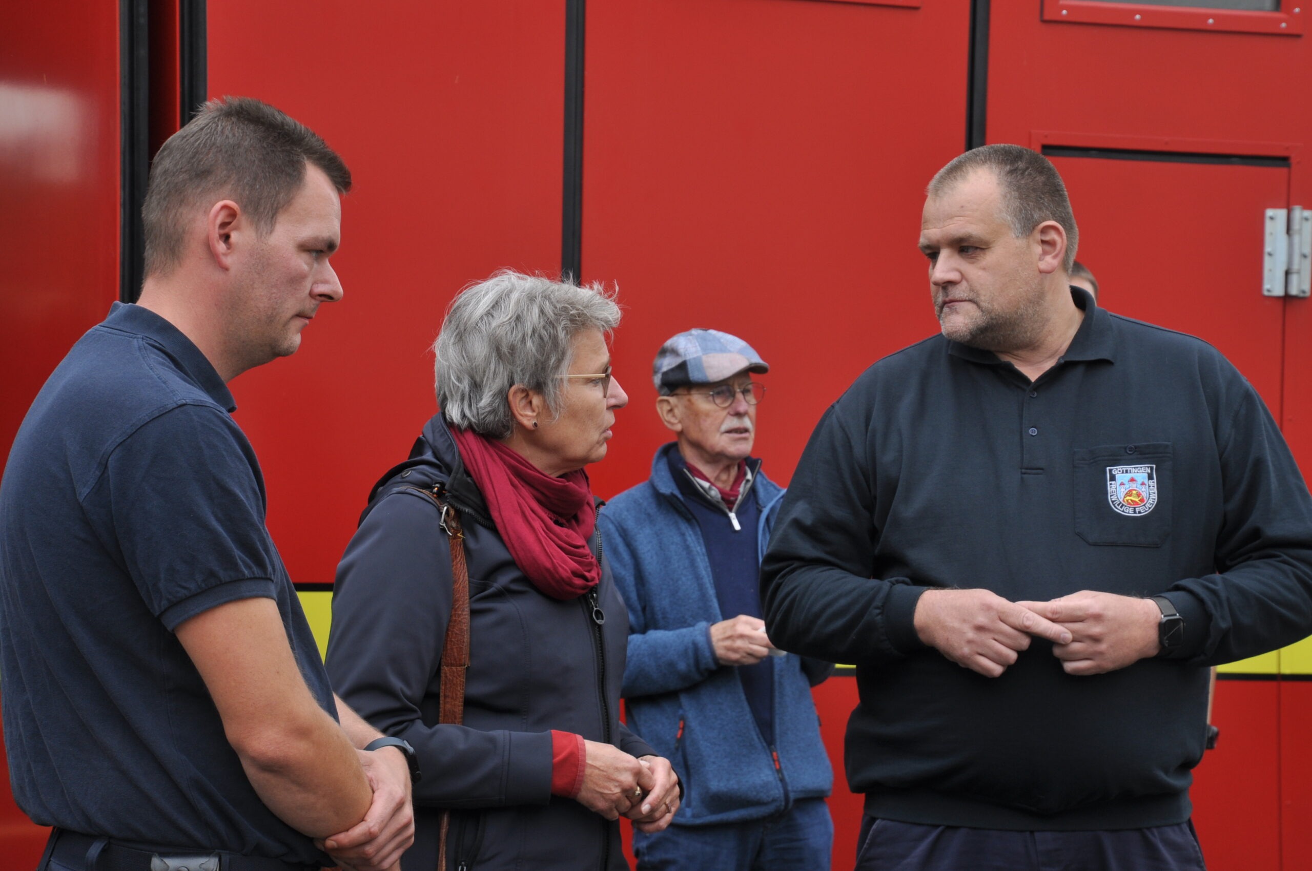 Innerhalb ihrer Tour durch den Ortsteil Geismar, schaute Göttingens Oberbürgermeisterin Petra Broistedt am Samstag, den 07. Oktober auch bei der Ortsfeuerwehr Geismar vorbei. Gut eine Stunde von ca.12.00 bis 13.00 Uhr informierte sich Frau Broistedt über die Arbeit und die derzeitige Situation um die OF Geismar. Die an der Arbeit der Feuerwehr sehr interessierte Oberbürgermeisterin ließ sich von Ortsbrandmeister Dirk Tetzlaff und seinen Kameraden alles haargenau erklären. Vor allen die Fahrzeugtechnik hatte es Ihr angetan und so war Sie auch stolz, auch mal hinter dem Steuer eines Löschfahrzeuges sitzen zu dürfen. Ortsbrandmeister Dirk Tetzlaff berichtete zusätzlich über den Ablauf der Ausbildung und die bisherige Anzahl von Einsätzen. Hier kam seitens Frau Broistedt die Frage auf, wie man als Ehrenamtlicher schwierige Einsätze verarbeitet. „Die Familien stehen voll hinter unseren Einsatzkräften und bringen uns dann wieder ins Lot“, so Patrick Klapproth und der Ortsbrandmeister ergänzte, dass man schon ein „Helfersyndrom“ haben muss, um die manchmal schwierig Arbeit anzugehen. Tetzlaff hob hierbei auch nochmal die gute Gemeinschaft innerhalb der Ortsfeuerwehr Geismar hervor. Zum Abschluss bedankte sich die Oberbürgermeisterin für die gute Aufnahme, dankte uns für die bisher geleistete Arbeit und wünschte uns alles Gute.