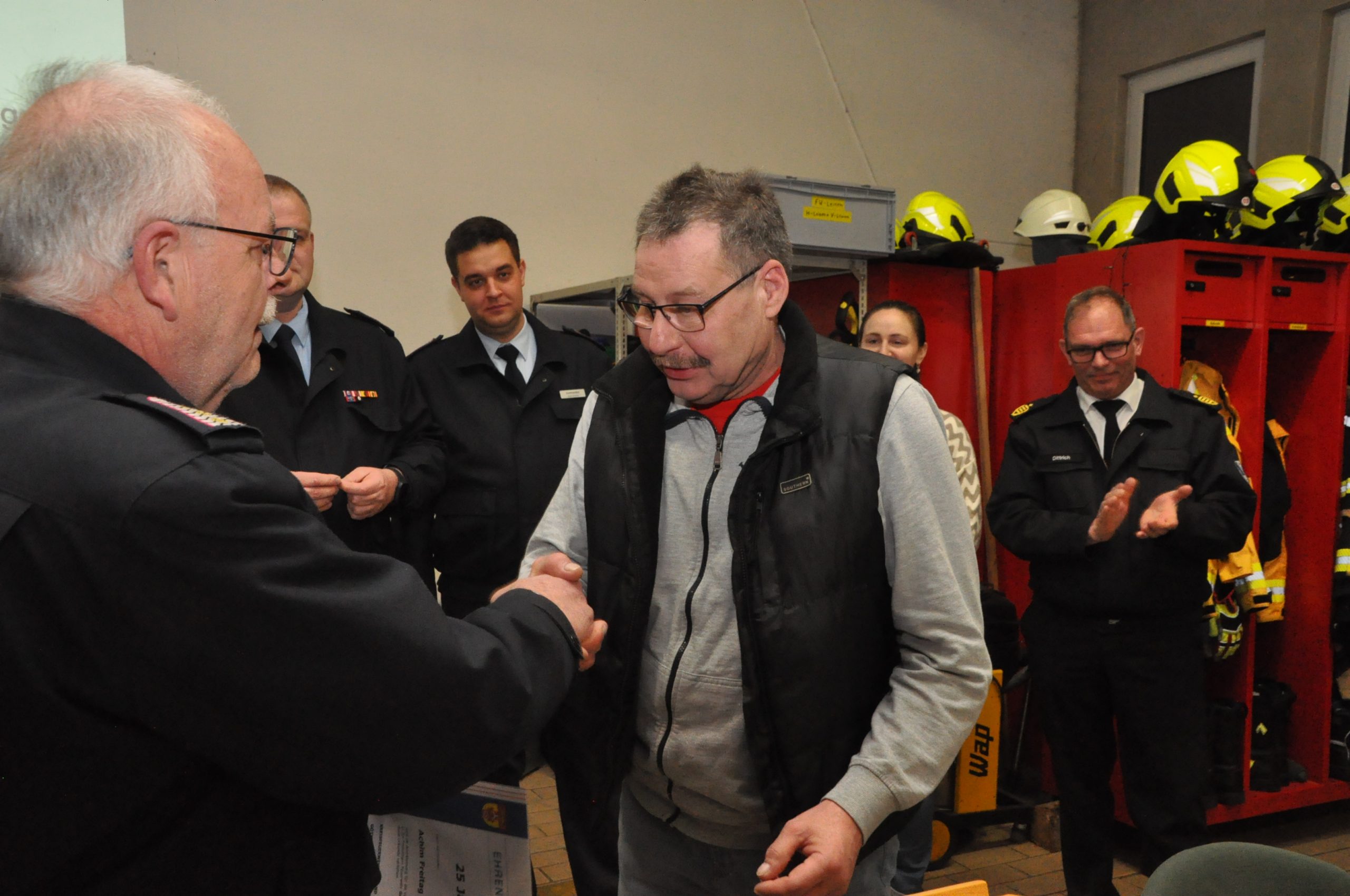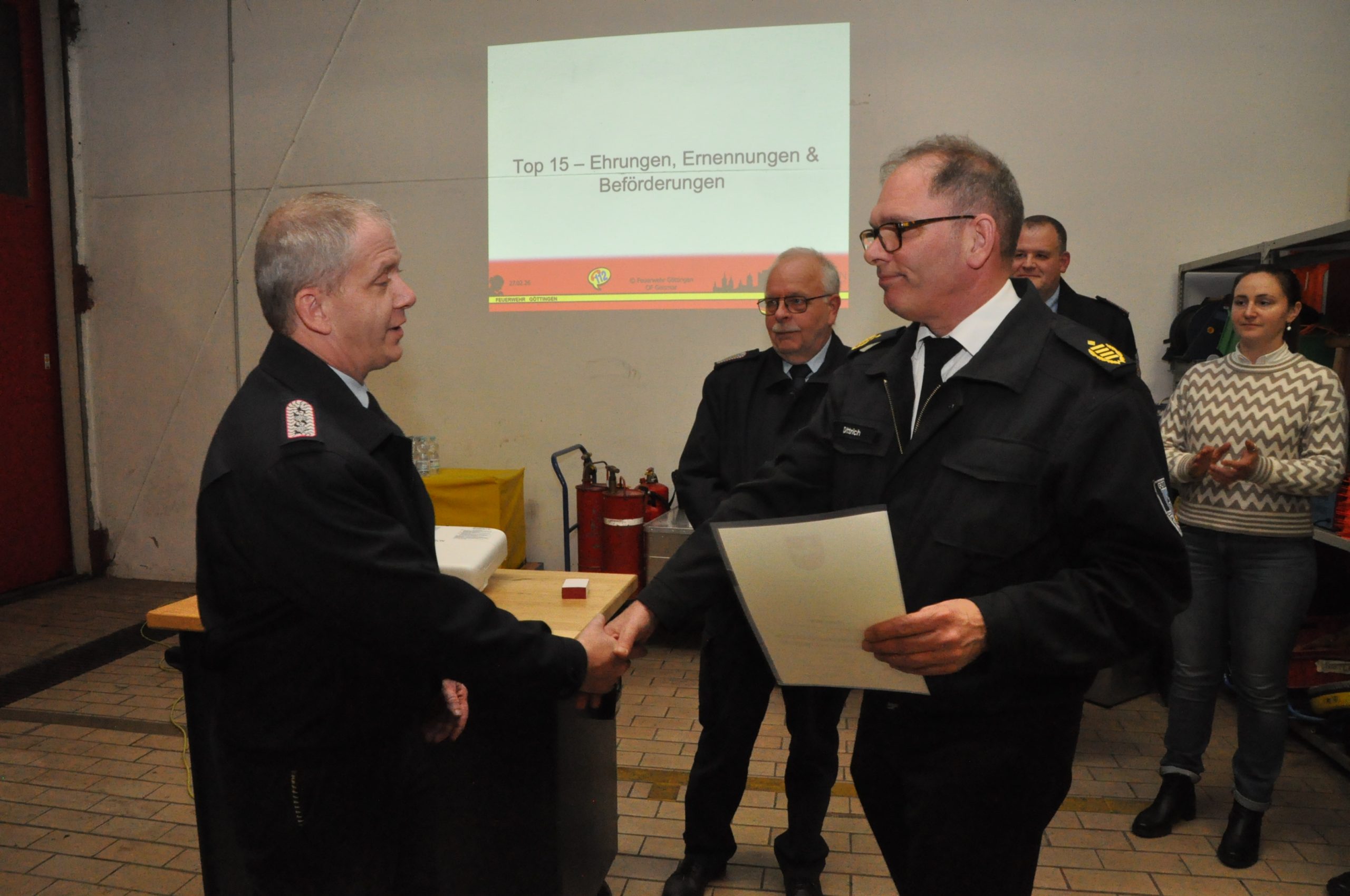 Natürlich standen auch Ehrungen und Beförderungen auf dem Programm. So wurden Mirko Meier für 40 Jahre und Eike Feile für 25 Jahre aktive Dienstzeit geehrt. Für 25 Jahre Mitgliedschaft im Kreisfeuerwehrverband wurden Achim Freitag, Jens-Uwe Feile und seine Frau Angela Feile sowie Joachim Arndt ausgezeichnet. Eine Anerkennungsprämie erhielten Stephan Meier, Andre Bolte und Stefan Pawlowski. Paul N. wurde zum Feuerwehrmann befördert. Die Hochwasser Ehren Medallie erhielt im Nachtrag noch Nils Harmann, Mirko Meier, Patrick Klapproth, Marlon Schreiber und Stephan Meier. Diese fünf waren bei der Verleihung im Dezember in Holtensen nicht anwesend.