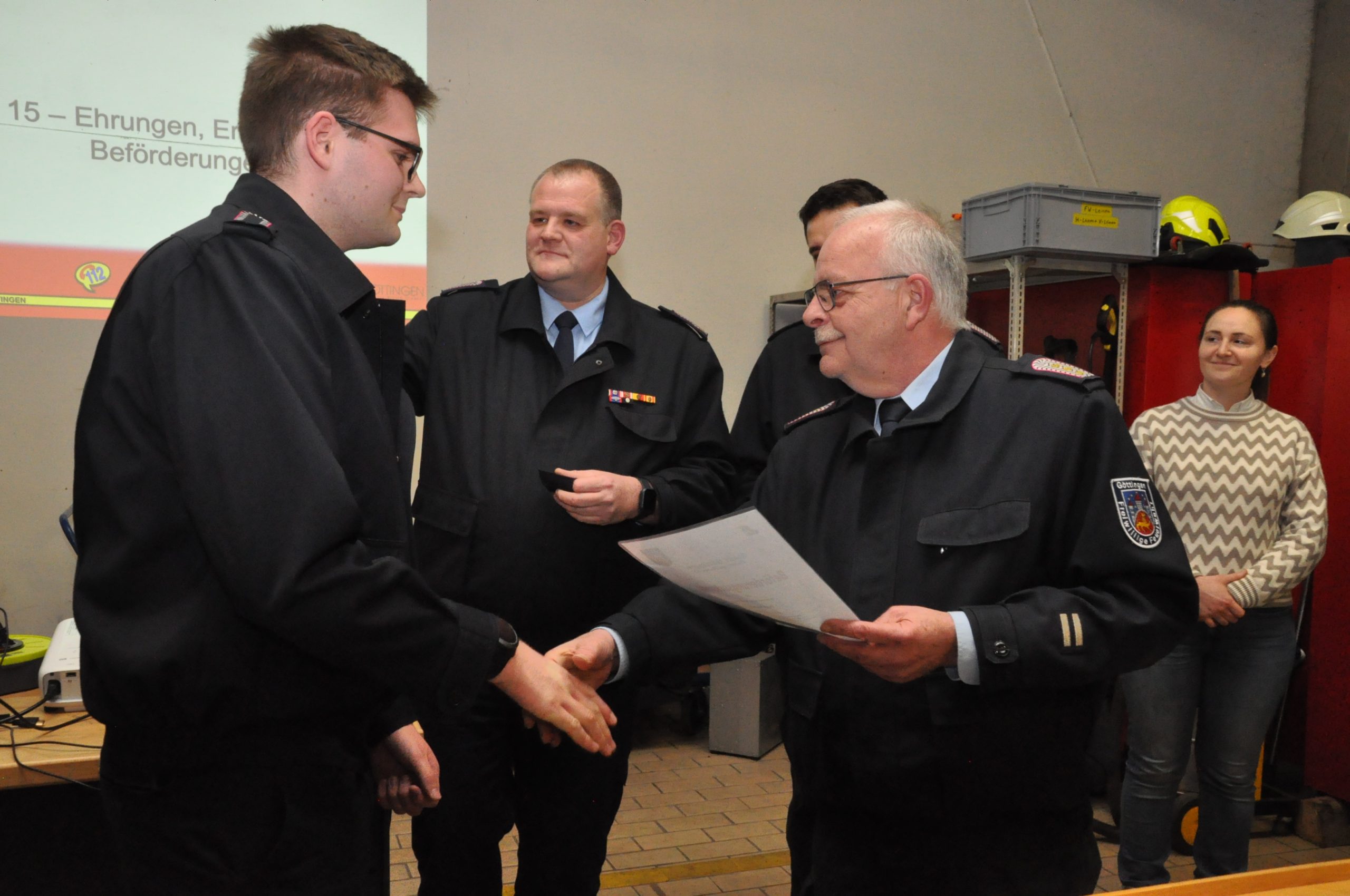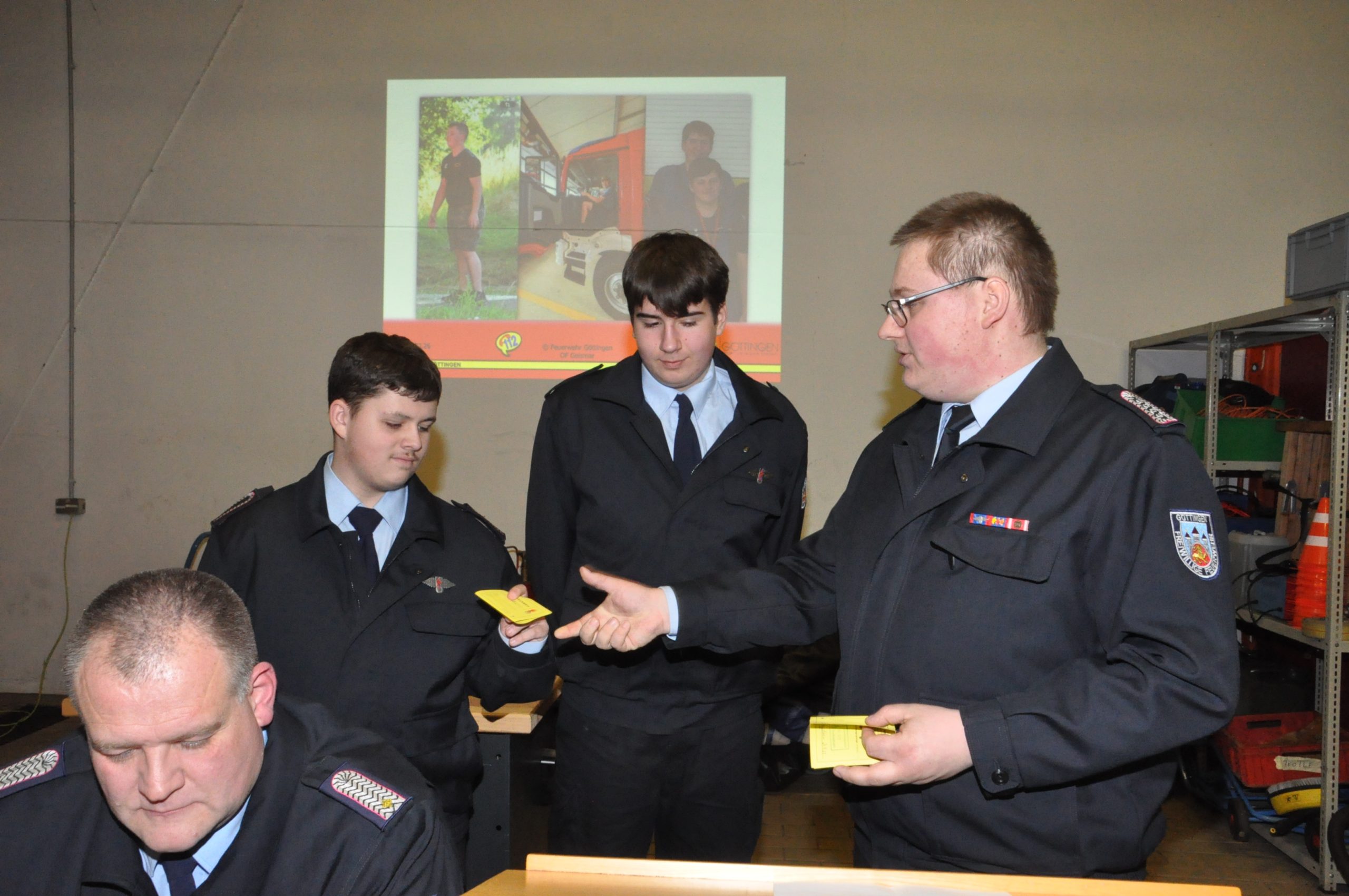 Die Jugendfeuerwehr zählt, wie auch im vergangenen Jahr, 14 Mitglieder, so Jugendwart Patrick Wenzel. Durch steigende Anforderungen in der Schule, mussten uns leider einige verlassen, aber wir haben auch einige dazugewinnen können. Insgesamt 33 Ausbildungsdienste wurden durchgeführt. Einige Kids nahmen erfolgreich an der Jugendflamme Teil 1,2 und 3 sowie der Leistungsspange erfolgreich teil. Der größte Erfolg war aber der 1.Platz bei den Stadtleistungswettbewerben. Damit wurde die JF Geismar Stadtmeister im Jahr 2025. Dadurch qualifizierten sie sich für den Bezirkswettbewerb in Meine, wo ein beachtlicher 42.Platz belegt wurde. Das Sommerzeltlager ging zusammen mit den JF Elliehausen und Esebeck an den Edersee. Im Laufe des Jahres wurden auch das THW und das DRK im Rahmen der Ausbildung besucht. Mit Niklas Nabroth und Maximilian Neisen konnten zwei Jugendliche in die Einsatzabteilung wechseln.