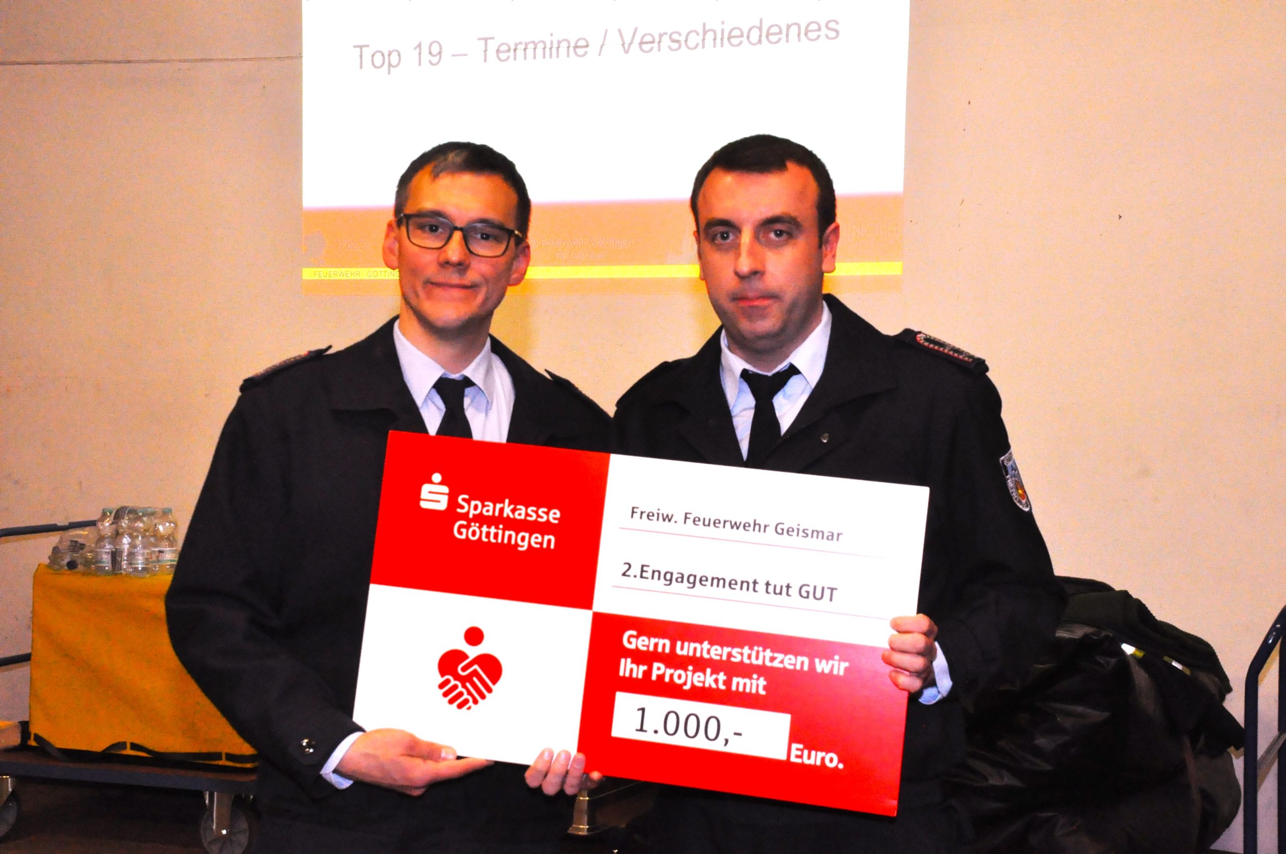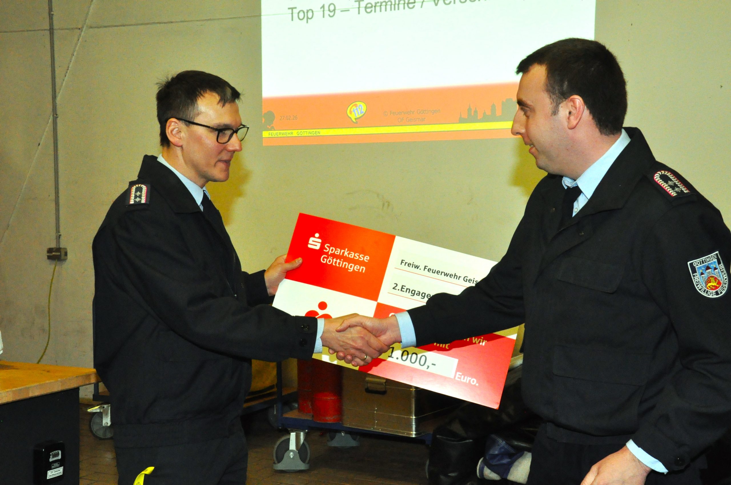 Beim Feuerwehrverein mit seinen zur Zeit 255 Mitgliedern musste der Vorstand neu gewählt bzw. bestätigt werden. Florian Kruck-Steuer wurde als 1. Vorsitzender wiedergewählt. Neuer Stellvertreter ist jetzt Nico Schmitz. Kassierer blieb Patrick Klapproth und neue Schriftführerin wurde Maryam Abtahean. Kassenprüfer Thomas Vollrodt wurde in seinem Amt bestätigt. Detlef Struck und Akif Wenzel kamen neu hinzu. Zum Schluss erhielt die Feuerwehr noch eine Spende über 1.000 € von der Sparkasse Göttingen. Diese Spende kam, durch eine erstmalig verliehende Auszeichnung „ENGAGEMENT TUT GUT“ ihrer Mitarbeiter zustande. Jan-Lukas Backhaus reichte sein ehrenamtliches Engagement bei der Freiwilligen Feuerwehr Geismar selbst für diese Auszeichnung ein und holte damit den 2.Platz. Das Preisgeld in Höhe von 1.000€ für dieses Projekt kann somit für die Kinder-und Jugendarbeit aber auch für die Einsatzabteilung genutzt werden.