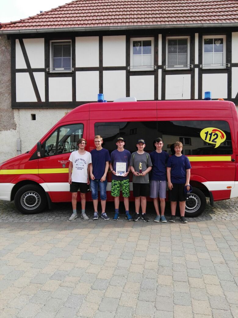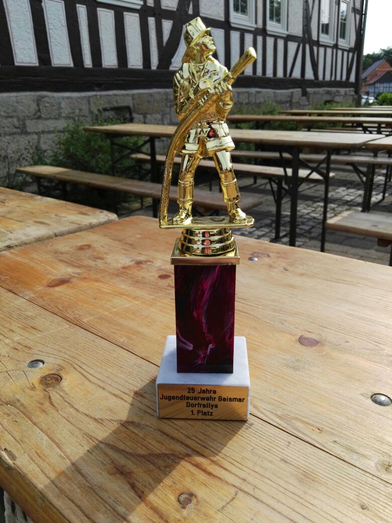 Aus Anlass des 25-jährigen Jubiläums der Jugendfeuerwehr Geismar/Eichsfeld wurde im Ort eine Dorfrallye veranstaltet. Hierzu war auch unsere Jugendfeuerwehr eingeladen. Die 6 Jugendlichen und zwei Betreuer kamen natürlich nicht mit leeren Händen. Ein kleines Gastgeschenk in Form von 2 Spielen (Winkinger-Schach und ein Riesenmikado) sowie einen Umschlag mit einen kleinen Betrag wurde den Gastgebern vor Beginn der Rallye überreicht. An der Dorfrallye nahmen insgesamt 7 Gruppen teil. Hierbei galt es in mehreren Spielen so viel wie möglich Punkte zu sammeln. Um 10.00 Uhr ging es los. Der Pakur beinhaltete u.a. einen Fragebogen, Erste Hilfe, Tischtennisbälle mussten auf einem Esslöffel durch Hindernisse gebracht werden, einen Feuerwehrleinen-Weitwurf und vieles mehr. Und das alles bei ca. 30° Hitze. Doch unsere Kids ließen sich davon nicht beeindrucken und holten den 1.Platz. Gegen 17.00 Uhr nach der Siegerehrung ging es dann wieder Richtung Heimat.