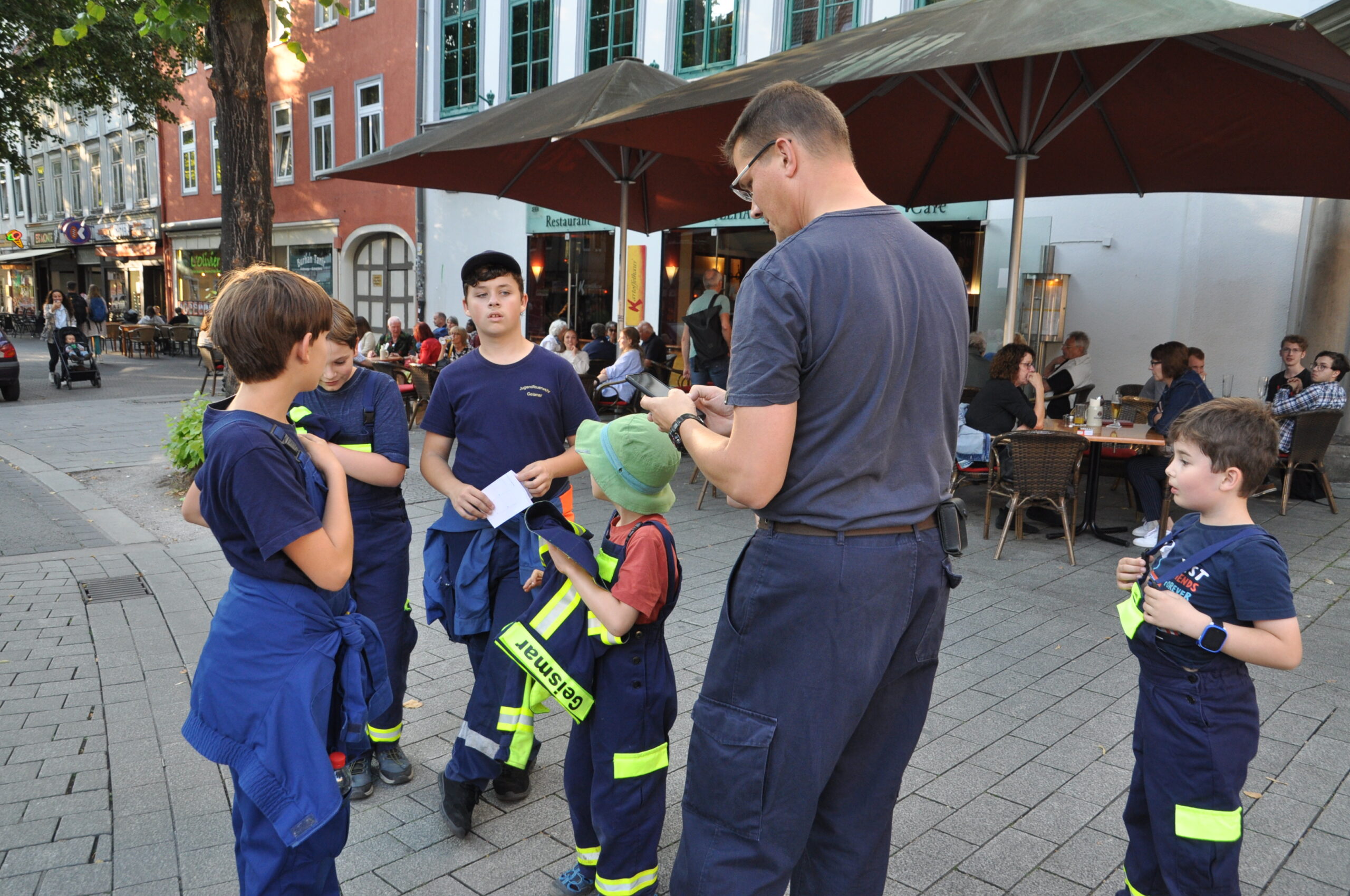 Der Verein „Jugendfeuerwehr Stadt Göttingen – Förderverein e.V.“ hatte am heutigen Freitag, den 15. September zu einer Veranstaltung in der Göttinger City eingeladen. Rund 90 Kinder und Jugendliche aus 4 Ortsfeuerwehren haben hieran teilgenommen. Die OF Geismar war mit 16 Kinder und Jugendlichen an dem Spiel „Suche nach Mister X“ dabei. Treffpunkt war um 16.45 Uhr am Albaniplatz vor der Stadthalle. Aufgeteilt in 3 Gruppen (halb Kinderfeuerwehr, halb Jugendfeuerwehr) ging es dann nach einer kleinen Einweisung gegen 17.00 Uhr für die drei Geismaraner Gruppen auf die Jagd nach den drei in der City befindlichen „Mister X“. Als Hinweis über den jeweiligen Aufenthaltsort wurde immer ein Foto vom Standort über Handy gesendet. Die Aufgabe war nun, diesen Ort so schnell wie möglich zu Fuß zu erreichen, damit man als Beweis, das man Mister X gefunden hat, einen Stempel auf dem Spielbogen bekam. Es ging quer durch die Göttinger City. Mal war es der Waageplatz, dann ging es wieder zurück zum Nabel oder wieder zum Botanischen Garten und wieder zurück zur Jacobikirche. Ziel war es, so viele Stempel wie möglich auf seinem Spielbogen zu haben. Rund 2 Stunden dauerte die Suche, bis sich alle Gruppen in der Kantine im 16. Stockwerk des neuen Rathauses wieder zur Siegerehrung trafen. Hier gab es kühle Getränke und heiße Würstchen. Die Gruppe Geismar 3 belegte den 6.Platz, Geismar 1 errang den 3.Platz und Geismar 2 holte sich den 2.Platz. Sieger wurde die Gruppe Groß Ellershausen 1. Am Ende waren alle geschafft, aber es hat einen Riesen Spaß gemacht.