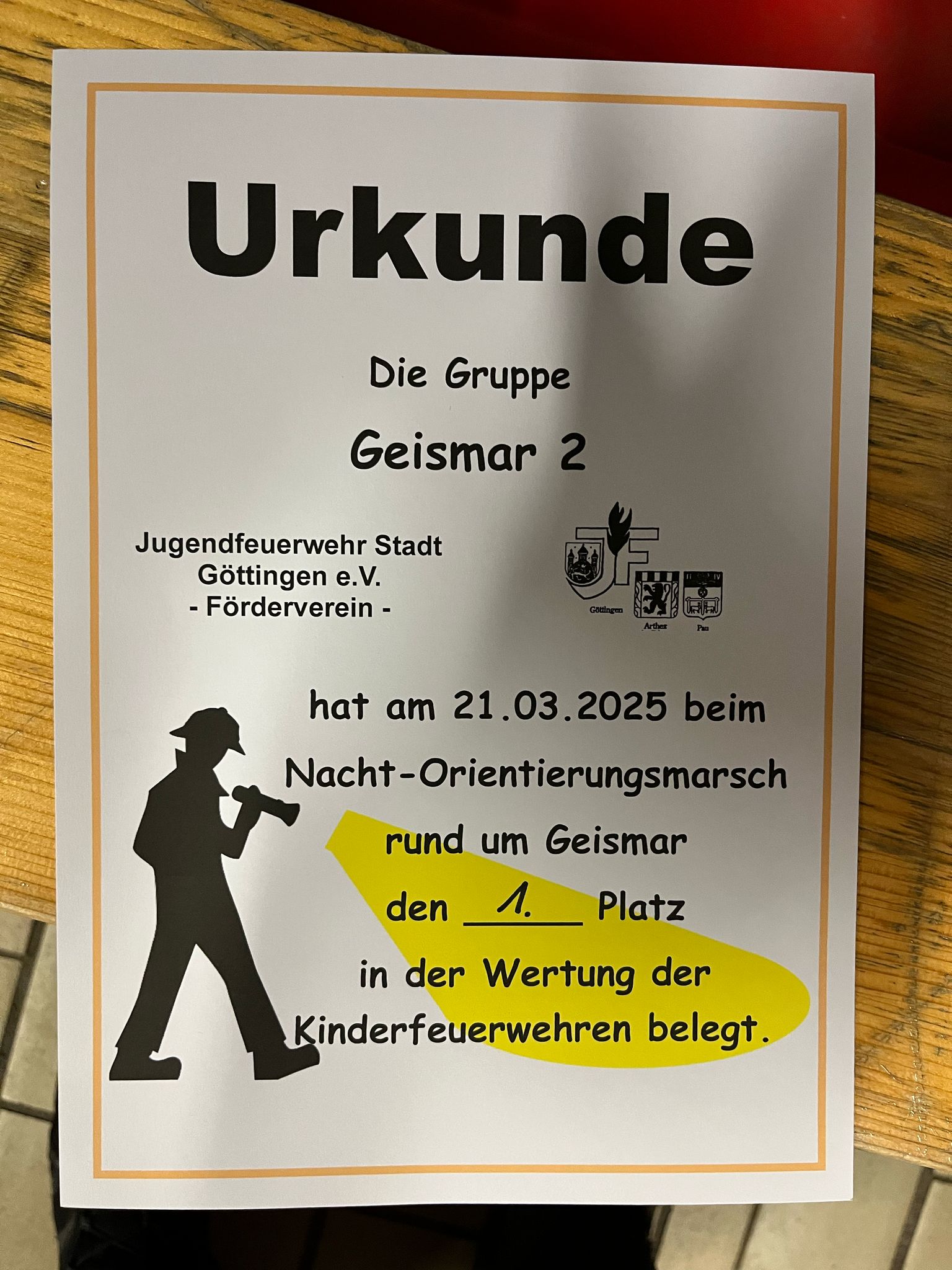 Am Freitag. den 21. März fand in Geismar ein Nacht-Orientierungs-Marsch des Fördervereins der Göttinger Jugendfeuerwehren statt. Insgesamt 11 Jugendfeuerwehren mit 16 Gruppen und 8 Gruppen der Kinderfeuerwehren der Stadt Göttingen nahmen hieran teil. Die Ortsfeuerwehr Geismar unterstützte mit 23 aktiven Kameradinnen und Kameraden diese Veranstaltung in Form von Streckenposten, am Grill, bei der Pommes und Getränkeausgabe und vieles mehr. Start und Ziel war das Feuerwehrhaus an der Kerllsgasse. Den Anfang machten um 18.00 Uhr die Gruppen der Kinderfeuerwehr. Die Gruppe Geismar 1 der Kinderfeuerwehr belegte sogar den 1. Platz und erhielt hierfür eine Urkunde. Gegen 18.40 Uhr folgten dann die Gruppen der Jugendfeuerwehren. Mindestens fünf Mitglieder pro Gruppe (incl. Betreuer) sollten es schon sein. Dann ging es quer durch das Altdorf in die Geismaraner Feldmarkt. An verschiedenen Stationen musste man gewissen Aufgaben erfüllen, wie z.B. ein Memory lösen, das „Haus vom Nikolaus“ mit einem Schlauch legen, Muttern auf eine Gewindestange drehen, oder Würfel auf einem Tuch so legen, dass „112“ rauskommt. Gegen 21.30 Uhr konnte dann die Siegerehrung der Kinderfeuerwehr und gegen 22.00 Uhr die der Jugendfeuerwehrgruppen stattfinden. Der 1. Vorsitzende des Fördervereins Helge Montag war zum Abschluss mit diesem Abend voll zufrieden. Es hat allen einen sehr großen Spaß bereitet.