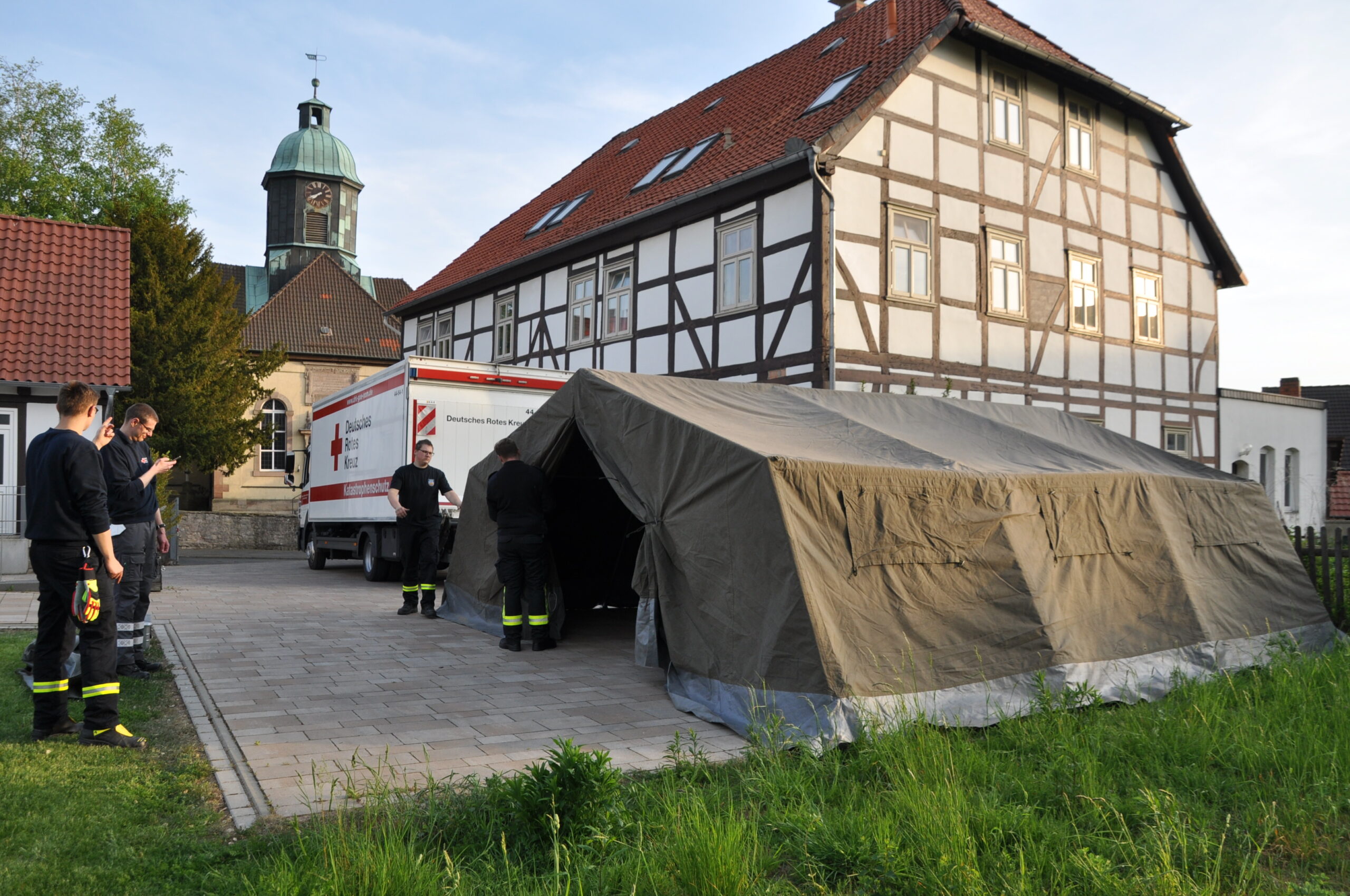 Für die alljährliche Altkleidersammlung der Martinsgemeinde hat die Ortsfeuerwehr Geismar beim Aufbau von einem Zelt geholfen. Das Zelt wurde vom DRK (Kreisverband Göttingen/Northeim) für die Zeit vom 16. Mai an für ca. eine Woche der Kleiderkammer der Martinsgemeinde, als Sammelstelle, kostenlos zur Verfügung gestellt, Am Freitag, den 13. Mai wurde das Zelt mit einem LKW des DRK durch Kräfte der OF Geismar geholt und anschließend mit sechs Mann dann auf dem Hof vor dem Gemeindehaus aufgebaut. Nach Beedigung der Sammlung wird die OF Geismar selbstverständlich auch wieder den Abbau und die Rückführung zum DRK übernehmen. Denn die Ortsfeuerwehr Geismar hilft und unterstützt dort wo Sie gebraucht wird und das 365 Tage im Jahr 24 Stunden am Tag nach dem Motto „ Unsere Freizeit für Ihre Sicherheit“.