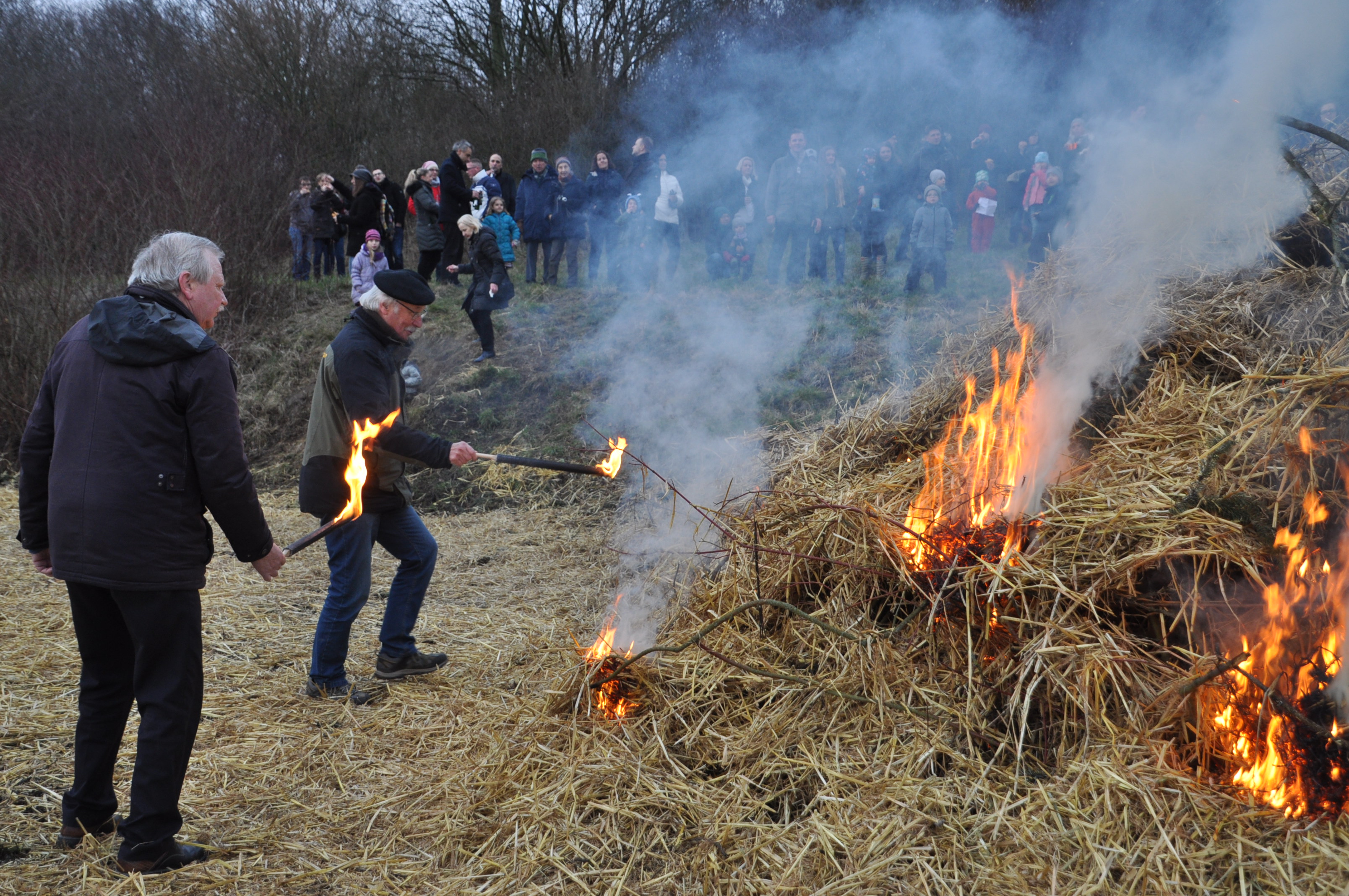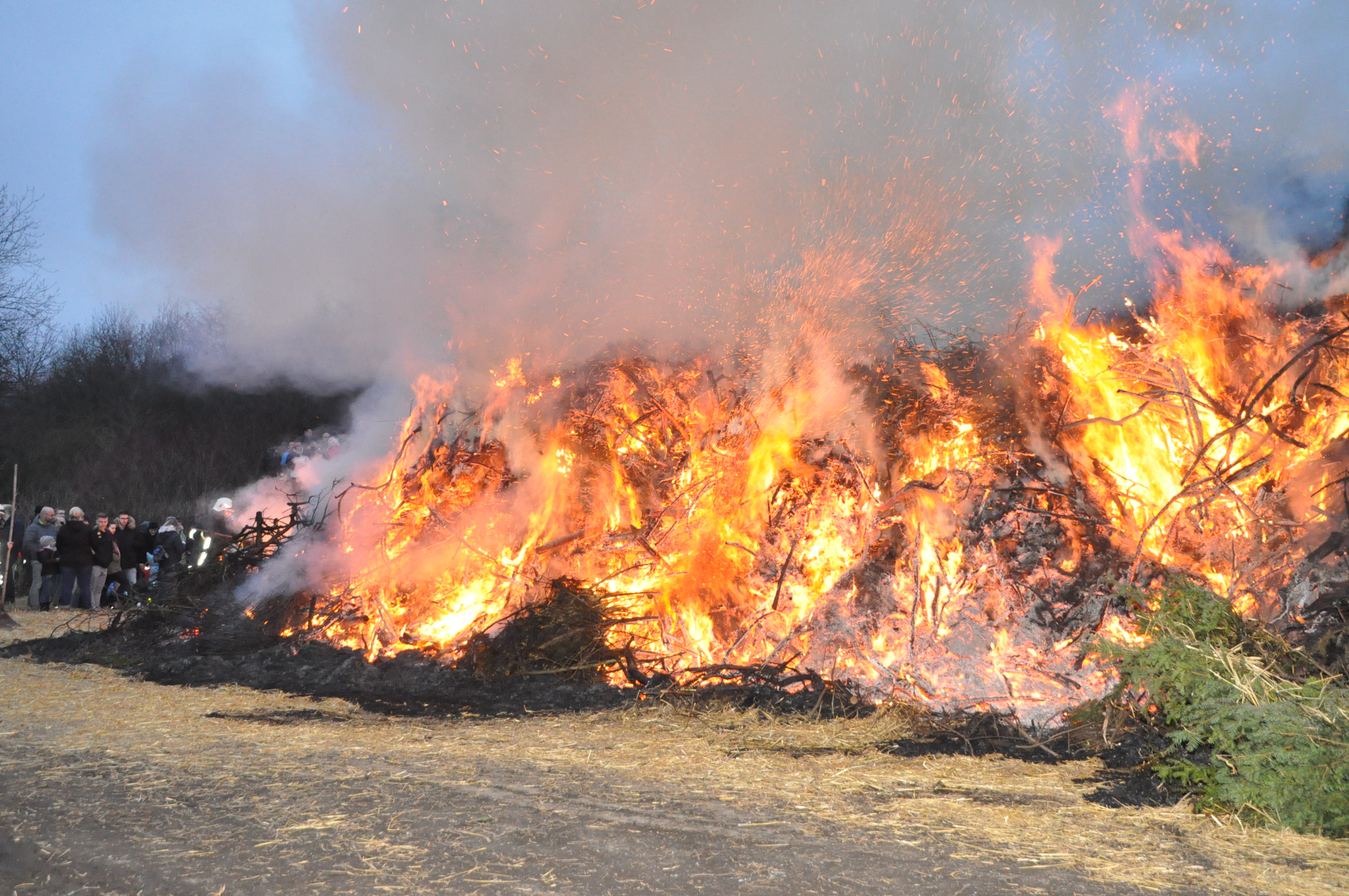Um 16.00 war dann Treffen am Feuerwehrhaus. Hier wurden alle Utensilien für den Aufbau der Stände auf die Fahrzeuge verladen. Am Osterfeuerplatz angekommen, wurde zügig mit dem Aufbau der Bratwurst- und Getränkestände begonnen. Gegen 19.30 Uhr wurde durch den stellvertretenden Ortsbürgermeister Peter Limpke und dem Ortsratmitglied Helmut Migge der große Haufen angezündet. Hier gilt unser Dank wieder unseren Mitgliedern Freddy Trettin und Jan Heinemann, die jeweils einen Ballen Stroh als kostenlose Spenden zur Verfügung stellten. Durch das Regenwetter der Tage zuvor war der Platz teilweise ziemlich schlammig geworden. Wir haben versucht, dieses durch aufgebrachtes Stroh einigermaßen begehbar zu machen. Nicht immer gelungen, aber der Wille zählt. Zum Glück hatte es gegen Mittag aufgehört zu regnen und zum Abend schaute auf mal die Sonne vorbei.