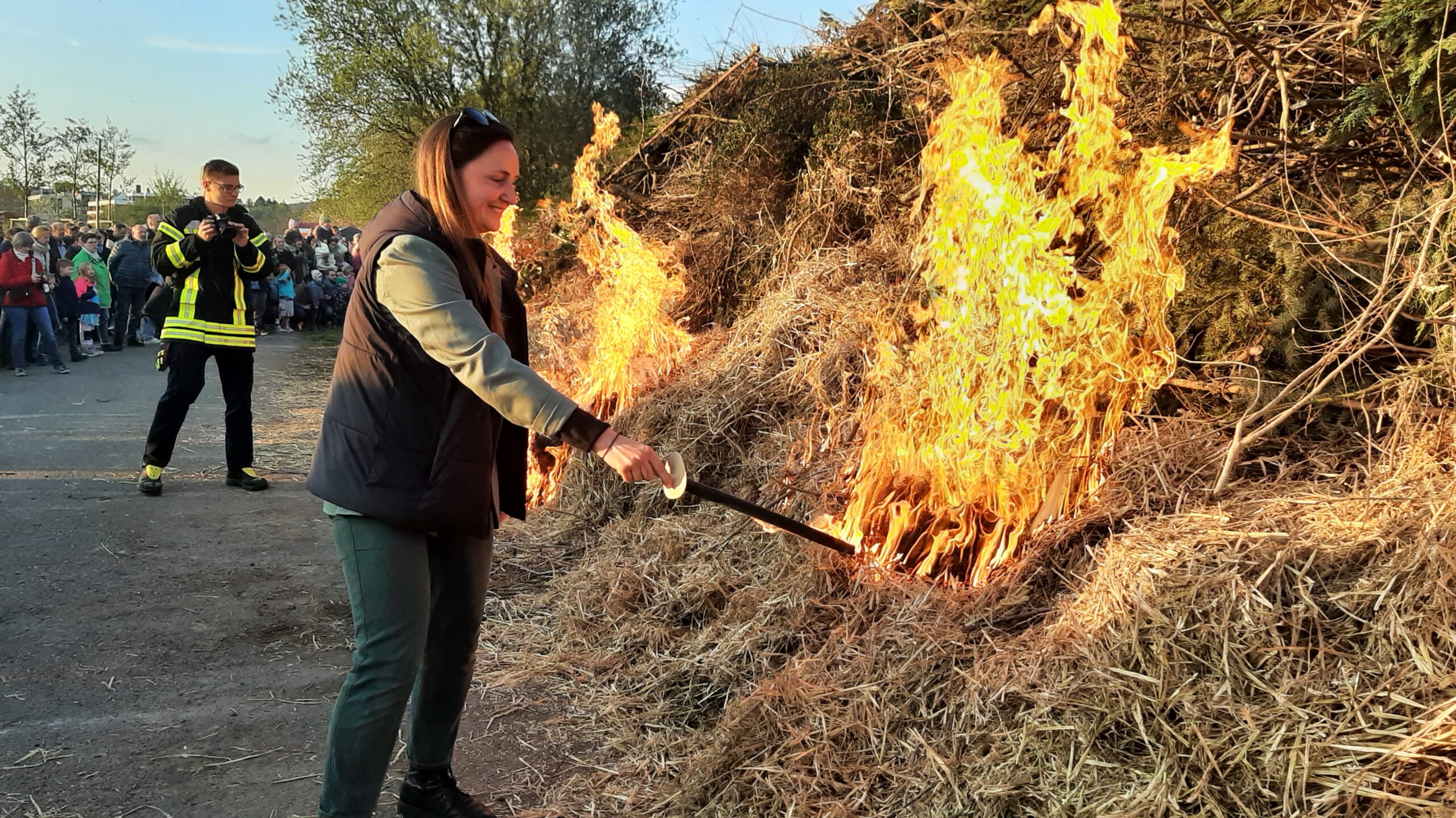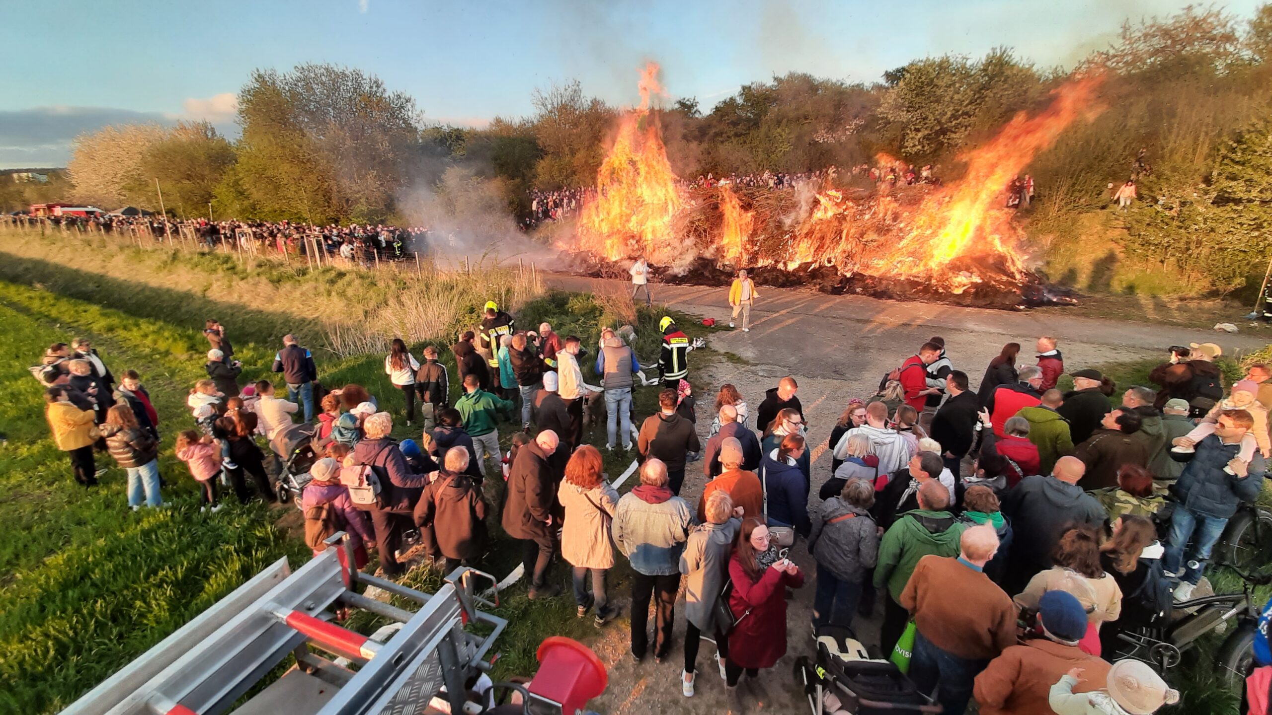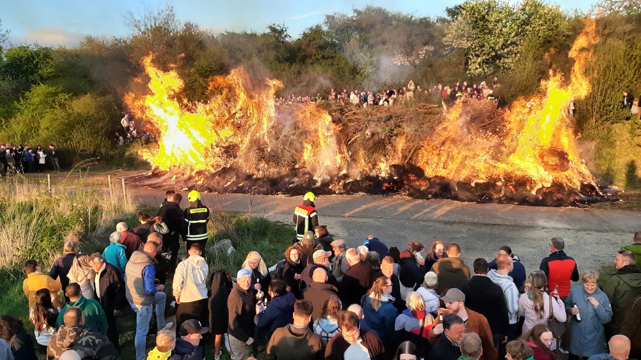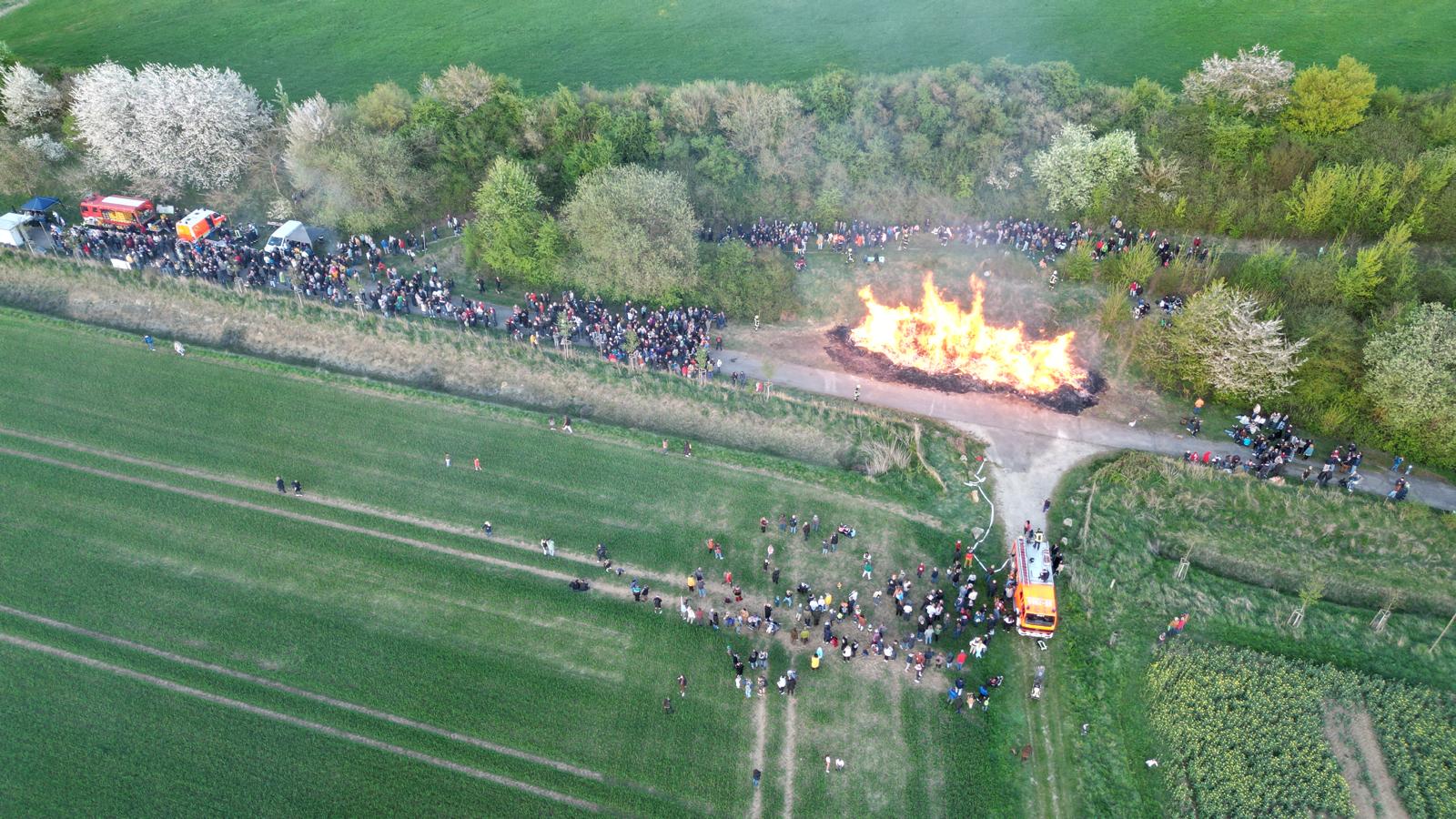 Beim diesjährigen Osterfeuer am Samstag, den 19. April war der Wettergott noch auf unserer Seite. Das Osterfeuer, verantwortlich hierfür war der Ortsrat, mit massiver Unterstützung durch die Ortsfeuerwehr und dem Feuerwehrverein Geismar fand wieder auf dem Gelände der ehemaligen Bauschuttdeponie an der Duderstädter Landstraße statt. Bereits am frühen Nachmittag trafen sich die ersten von uns, um alles, was benötigt wurde, auf die Fahrzeuge zu laden. Mit 40 Aktiven, 6 Jugendliche der Jugendfeuerwehr und 3 passive Mitglieder wurden dann die Stände aufgebaut. Aufgeteilt in Gruppen für Technik, Grill, Getränke, Kasse und die Brandsicherheitswache am Feuer, hatte anschließend jeder seine Aufgabe. Bei bestem Wetter strömten die Besucher aus allen Richtungen zum Osterfeuerplatz. Die Schlangen an den Ständen wurden immer länger. Daher musste das Personal viel rotieren und hatte alle Hände voll zu tun. Getränke waren reichlich vorhanden, doch Grillkäse und Bratwurst mussten im Laufe des Abends nachgeholt werden. Die Jugendfeuerwehr bot wieder Stockbrot an einer separaten Feuerstelle an. Kurz vor 20.00 Uhr entzündete unsere Ortsbürgermeisterin Leila Morgenroth mit großer Unterstützung durch unsere Jugendfeuerwehr mit Fackeln den riesigen Haufen. Im Nu brannte das Osterfeuer in voller Ausdehnung und manche nahmen vor der entstandenen Hitze reißaus. Bei der Brandsicherheitswache am Osterfeuer gab es glücklicherweise keine Vorkommnisse. So herrschte den ganzen Abend eine super tolle und ausgelassenen Stimmung. Gegen 23.00 Uhr begann der Abbau der Stände. Um das Feuer herum ging es mit der guten Stimmung aber weiter. Bis zum frühen Sonntagmorgen blieb noch eine 4-köpfige Brandwache mit unserem Tanklöschfahrzeug vor Ort.