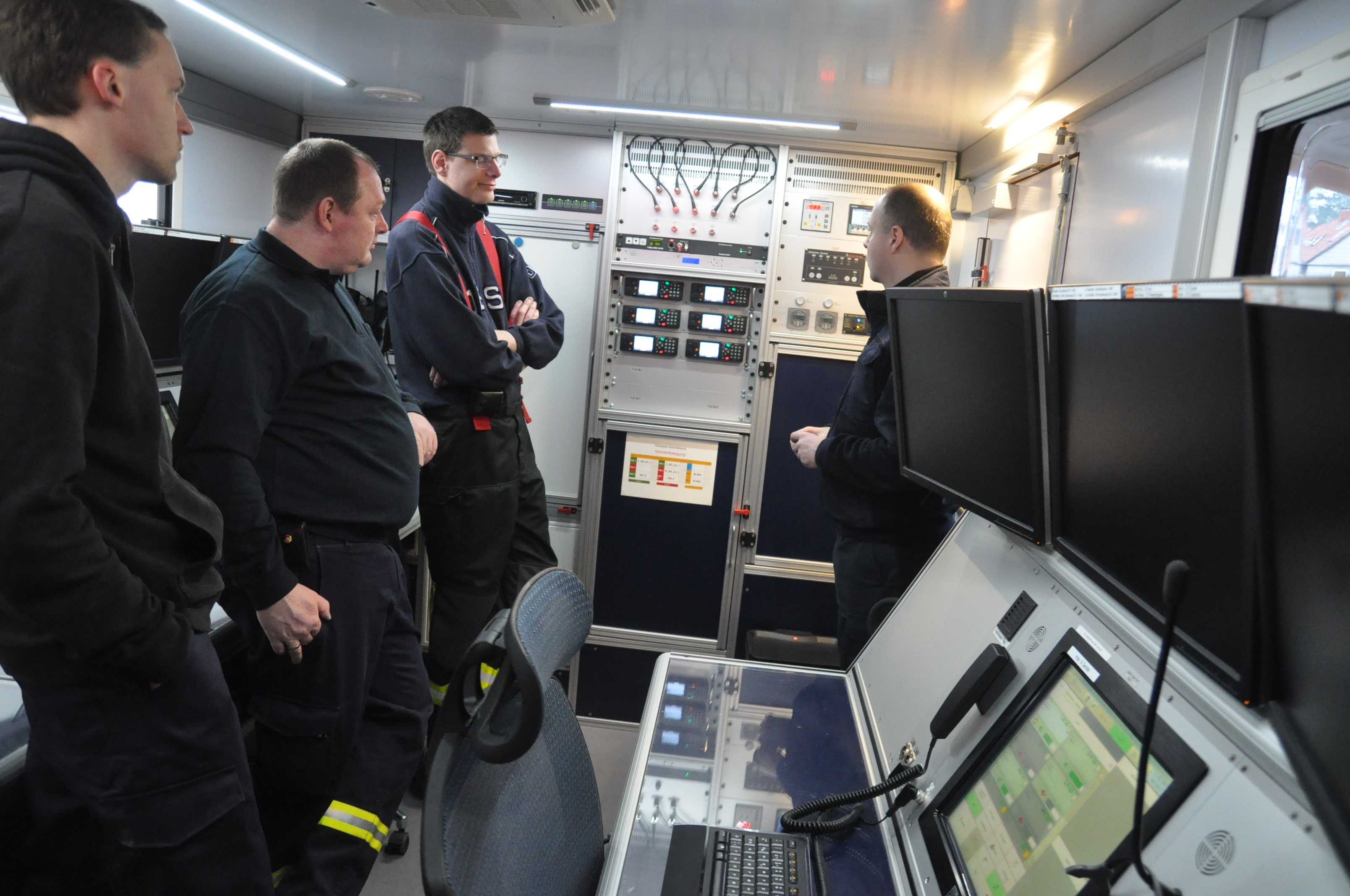 Das Fahrzeug hat einen Funkraum, sowie einen Besprechungsraum, getrennt durch eine Wand. Der Funkraum hat drei Arbeitsplätze, die fast identisch mit denen in der Leitstelle sind. Das Fahrzeug kann somit auch als Rückfallebene benutzt werden. Sechs verschiedene digitale Funkrufgruppen können von hieraus bedient werden. Vom Besprechungsraum aus kann u.a. eine an einem Masten befestigte Kamera und die Satellitenschüssel gesteuert werden.