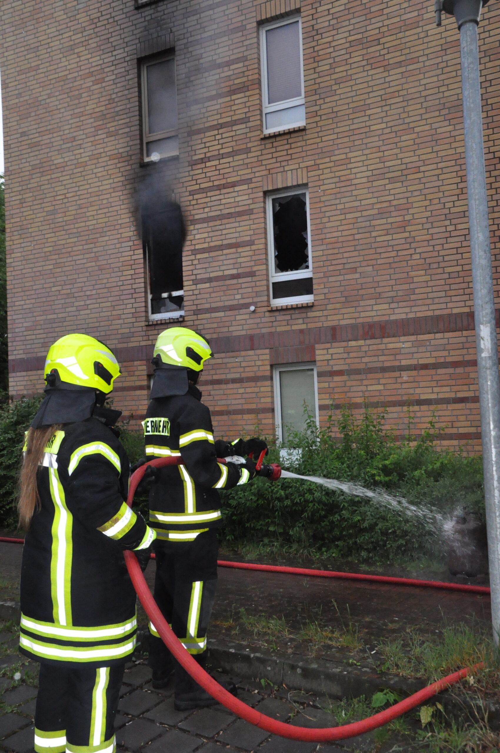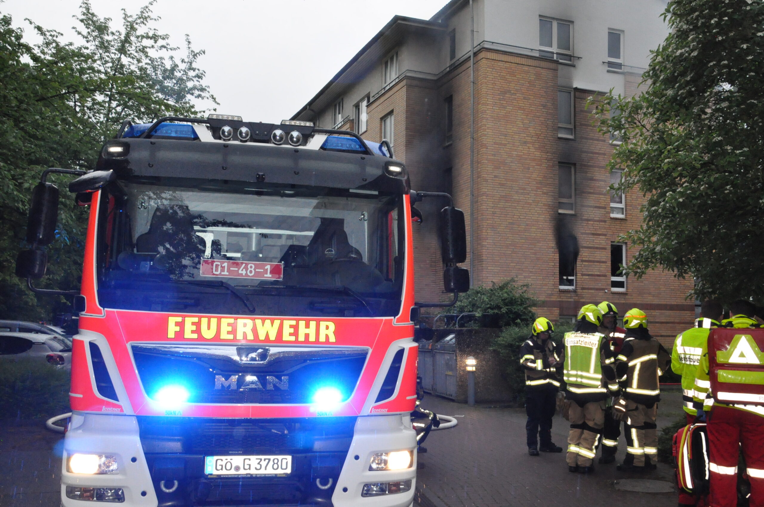 Nach dem Brandeinsatz am Freitagabend auf den Zietenterrassen kam es am frühen Pfingstsonntagmorgen, den 19. Mai wieder zu einem größeren Brandeinsatz in dem neu gestaltenden Wohnviertel. Alarmiert wurde die Ortsfeuerwehr Geismar über DME um 05.22 Uhr, eigentlich „nur“ zu einem Balkonbrand in den Elisabeth-Heimpel-Weg. Die Polizei, die als erstes eintraf, fand dann aber eine komplett in Vollbrand stehende Drei-Zimmer-Eckwohnung im 1. Geschoss eines Mehrfamilienhauses vor, Flammen schlugen bereits aus den Fenstern und es kam zu einer starken Rauchentwicklung. Da zu diesem Zeitpunkt noch nicht klar war, wie viele Personen sich noch im Haus befanden, wurde sofort eine Menschenrettung eingeleitet. Hierbei unterstützten dann auch gleich Kräfte der OF Geismar. Die beiden Bewohner der betroffenen Wohnung konnten sich selbst in Sicherheit bringen und wurden dann vom Rettungsdienst übernommen. Jeweils eine Person konnte aus dem Dach- bzw. Erdgeschoß unversehrt ins Freie gebracht werden. Ansonsten hatte alle weiteren Bewohner das Gebäude bereits verlassen. Die OF Geismar war mit einer Stärke von 1/23 und 4 Fahrzeugen vor Ort. Ein Trupp wurde mit zur Menschenrettung eingesetzt, 4 weitere Trupps übernahmen dann nacheinander die Nachlöscharbeiten bzw. die Abschlusskontrolle der Wohnung. Außerdem waren Kräfte unserer Ortsfeuerwehr Geismar für die Wasserversorgung zuständig. Da in unmittelbarer Nähe kein Hydrant zu finden war, musste über die fast ganze Länge des Elisabeth-Heimpel-Weges eine B-Leitung zur Versorgung des HLF Süd der Berufsfeuerwehr verlegt werden. Das Feuer war gegen 06.05 Uhr unter Kontrolle. Um 07.20 Uhr war dann alles abgelöscht und es konnte „Feuer aus“ gemeldet werden. Ebenfalls an der Einsatzstelle war die OF Stadtmitte mit dem GW-Hygiene und dem GWL-1. Die OF Weende und die nebenberuflichen Kräfte der Uni-Feuerwehr hatten Bereitschaft in der Wache Nord, um während des Einsatzes den Brandschutz für das restliche Stadtgebiet zu gewährleisten.