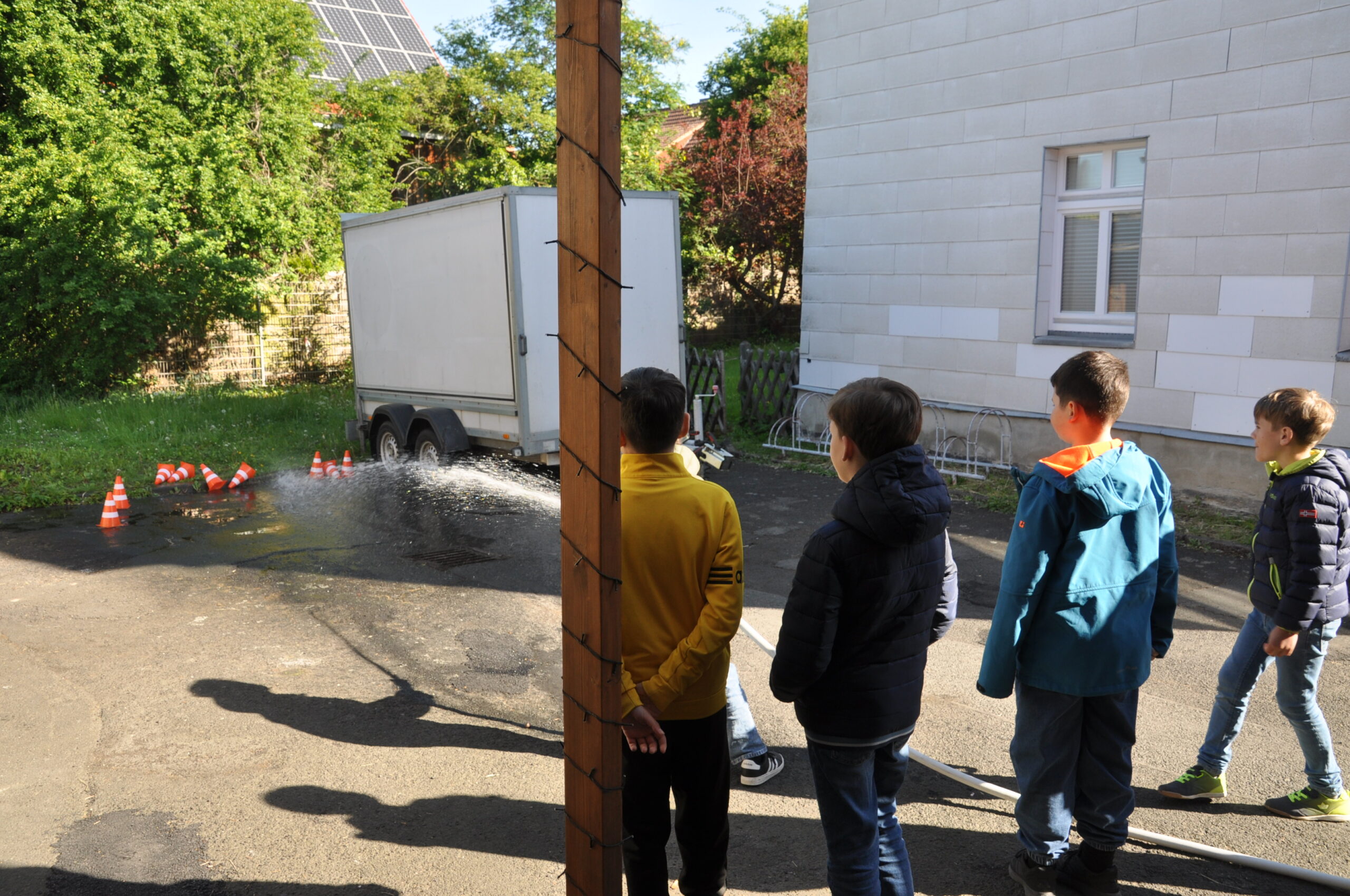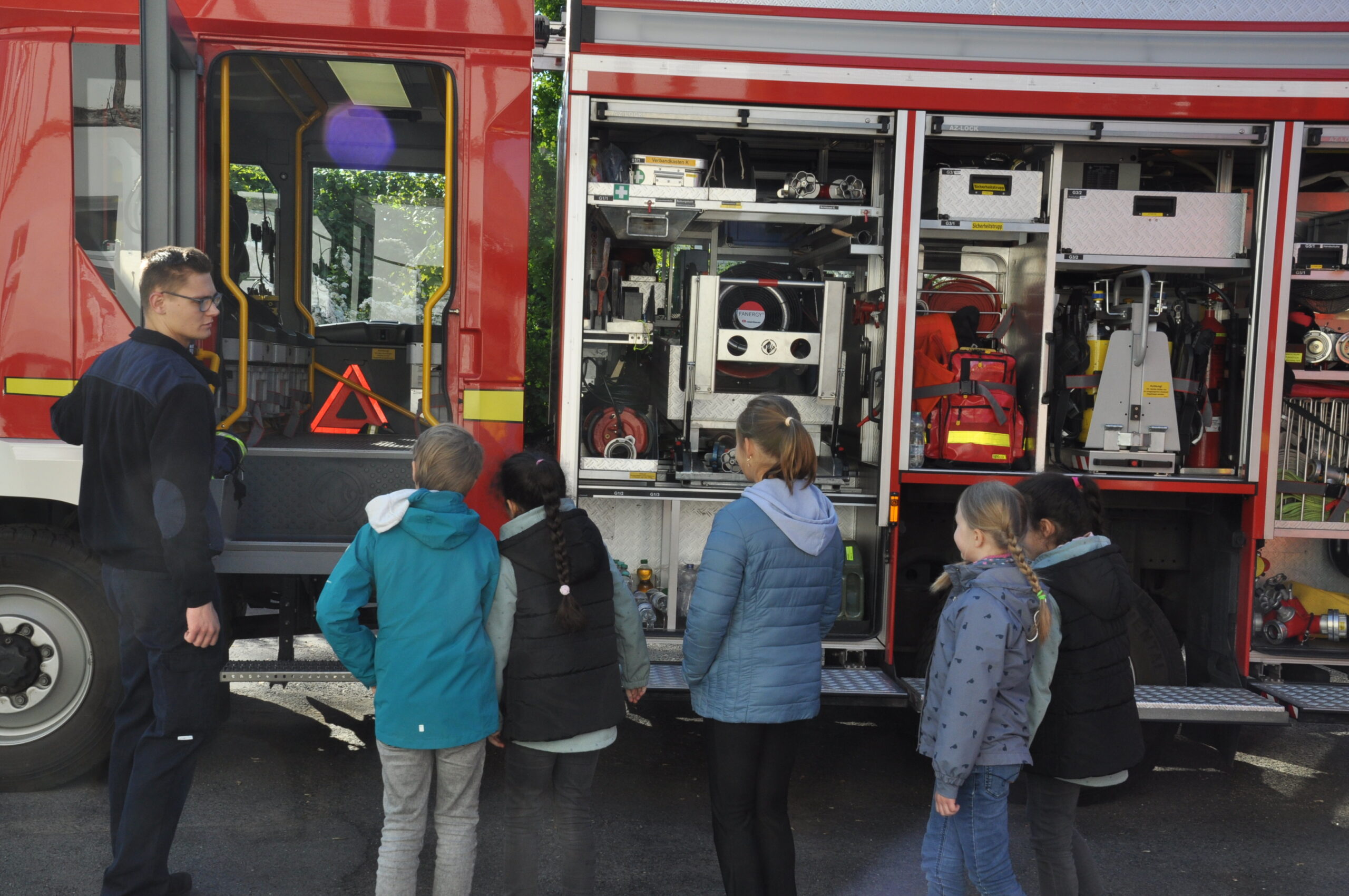 Gleich am folgenden Montag, den 12. Mai war dann die Klasse 3 b der Adolf-Reichwein-Schule bei uns zu Gast. Diese mal waren es 22 Jungen und Mädchen im Alter von 8 Jahren bis knapp an die 10, die uns von 08.15 bis 10.45 Uhr inclusive ihrer Klassenlehrerin Louisa Müller und den zwei Betreuern Corinna Hilterhaus und Jonas Samoski die OF Geismar besuchten. Auch an diesem Tag waren wir wieder 4 Aktive. Wir fuhren unser Löschfahrzeug LF 20 KatS auf den Hof. In der Halle konnten sich die Kids wieder als „Feuerwehrmann (oder-frau) verkleiden und bekamen viele Informationen über unsere Einsatzbekleidung. Am Löschfahrzeug wurde die Technik und die verschiedenen Gerätschaften bestaunt, sowie natürlich einmal auf den Sitzplätzen sich fühlen, als wenn man bereits dabei wäre. Und natürlich durfte auch diese mal das Spritzen mit Wasser nicht fehlen. Verschiedene Kegel bildeten die „Flammen“ und auch unser Anhänger oder die Büsche im Hintergrund wurden mal angepeilt. Es ist immer wieder eine Freude, den Kids bei so einem Besuch zuzuschauen. Es gibt nichts schöneres, als in die leuchtenden Kinderaugen zu schauen, oder zu sehen, wie euphorisch die Kids bei manchen Sachen mitmachen.