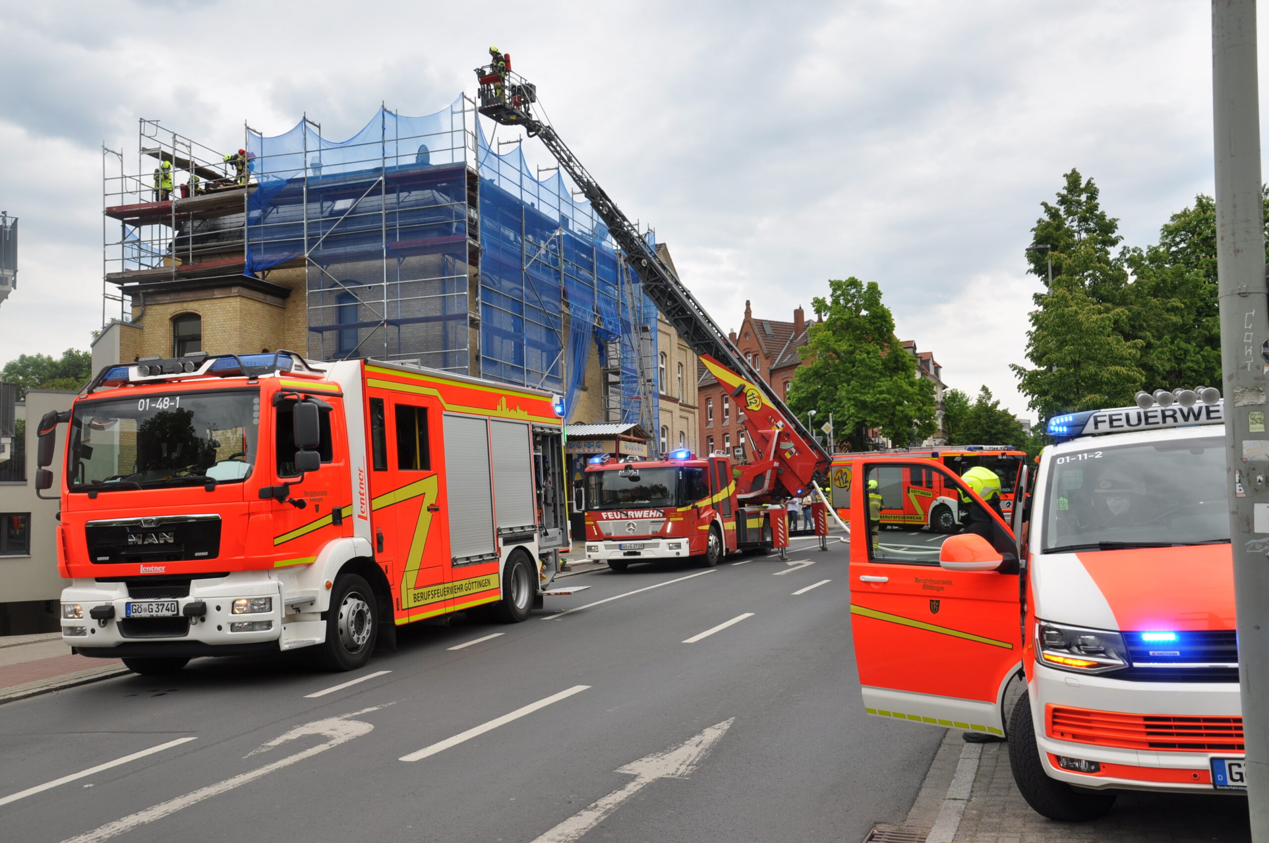 Am Donnerstagnachmittag, den 03. Juni wurde die Ortsfeuerwehr Geismar um 16.51 Uhr über DME zu einem Dachstuhlbrand eines Wohn- und Geschäftshauses in der Geismar Landstraße alarmiert. Zusätzlich zum Löschzug der Berufsfeuerwehr wurden auch die HLF`s der Wache West und der Wache Klinikum sowie die OF Stadtmitte ebenfalls in den Einsatz eingebunden. Bei Ankunft an der Einsatzstelle war eine starke Rauchentwicklung im Dachbereich erkennbar. Es brannten Baumaterialien auf dem Dach. Zum Einsatz kamen ein C-Rohr und die Drehleiter. Nach gut zehn Minuten war das Feuer unter Kontrolle, sodass das HLF West und die OF Stadtmitte Ihre Einsatzfahrten abbrachen. Um 17.09 Uhr konnte bereits „Feuer aus“ gemeldet werden. Die OF Geismar rückte mit dem LF 20 KatS (1/8) und dem TroTLF 16 (1/5) an, hatte aber wie bei den vorherigen Einsätzen auch, keine Tätigkeiten an der Einsatzstelle und rückte somit um 17.29 Uhr wieder einsatzbereit ins Feuerwehrhaus Geismar ein.
